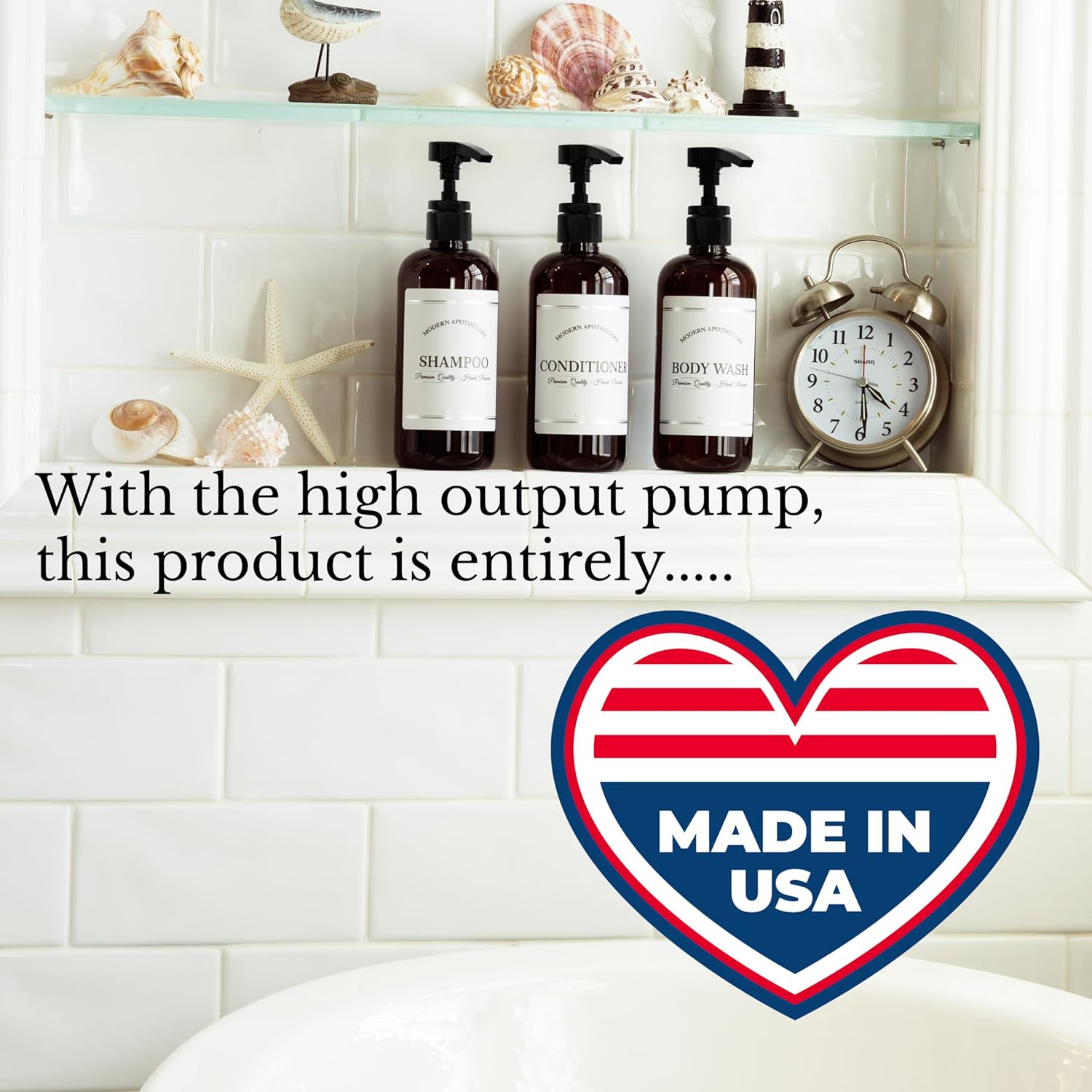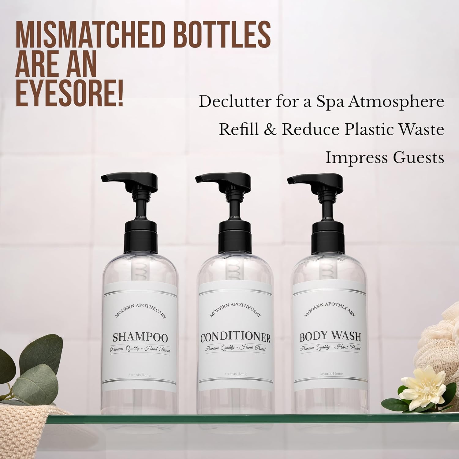 • Bring Style To Your Bathroom: Revel in the luxury of a well-organized shower. Refine your interior decor with these chic body wash, conditioner and shampoo dispenser bottles. Curate your whole home. Modern Apothecary bathroom bottles coordinate with additional matching titles for the sink, kitchen, office, and rentals. Classy, with a touch of retro flair