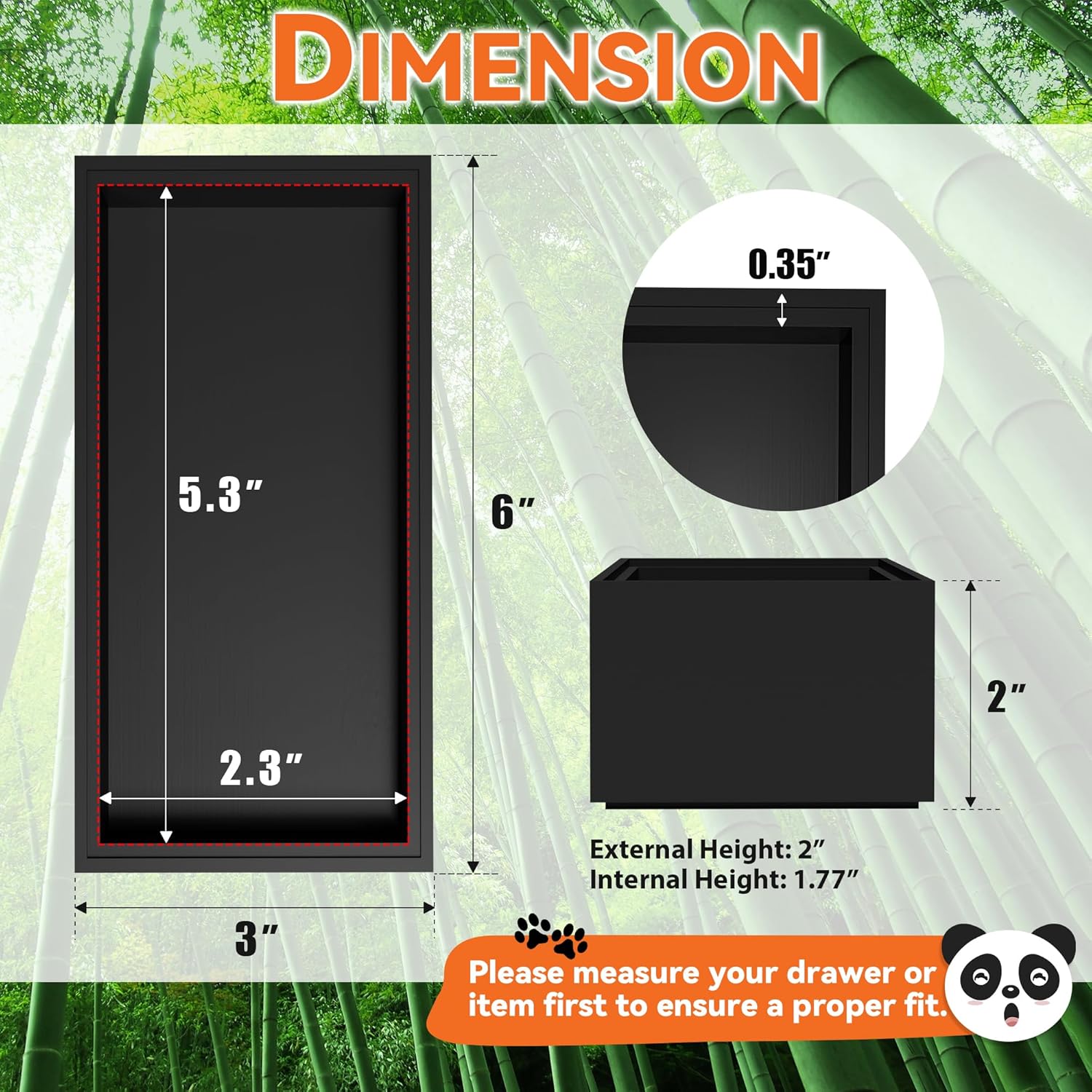 - Each bamboo drawer organizer measures: external size: 6" L x 3" W x 2" H; internal size: 5.3" L x 2.3" W x 1.77" H. Please check the size before purchasing