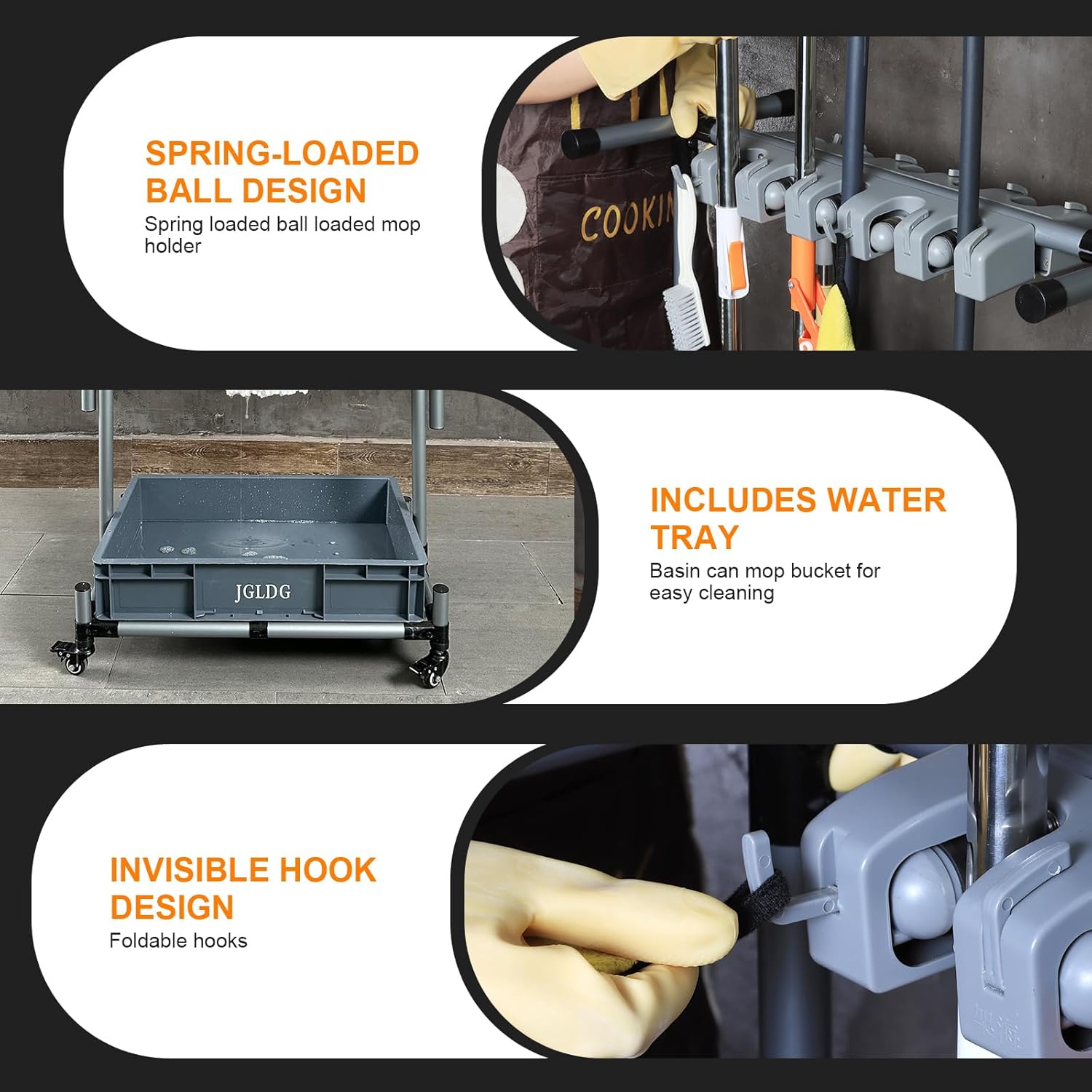 • 2. 【Easy Mobility】: With four silent wheels equipped with brakes, this rack can be easily moved around your home or workplace. The wheels reduce the physical strain of carrying heavy tools, enhancing your cleaning efficiency.