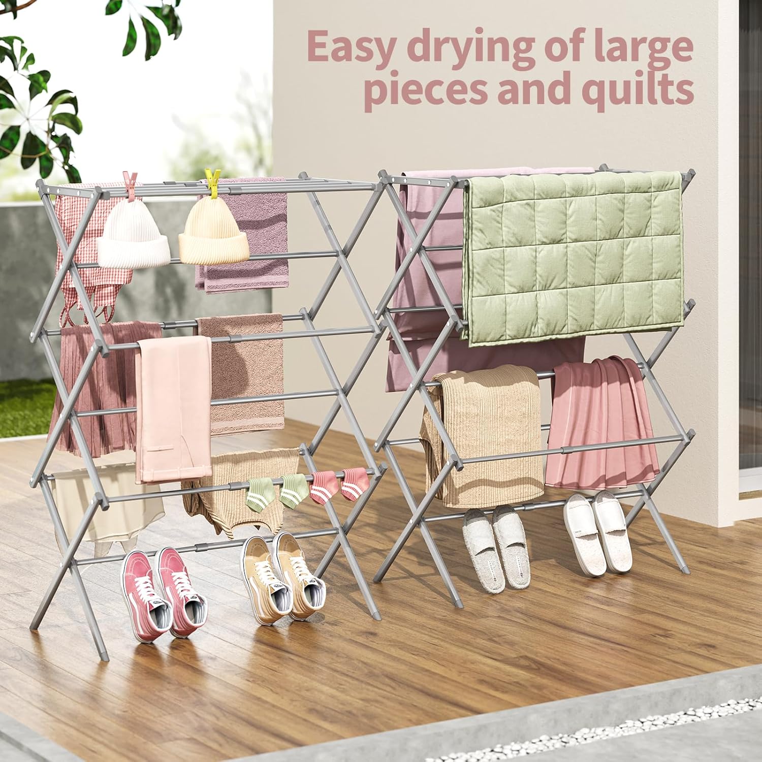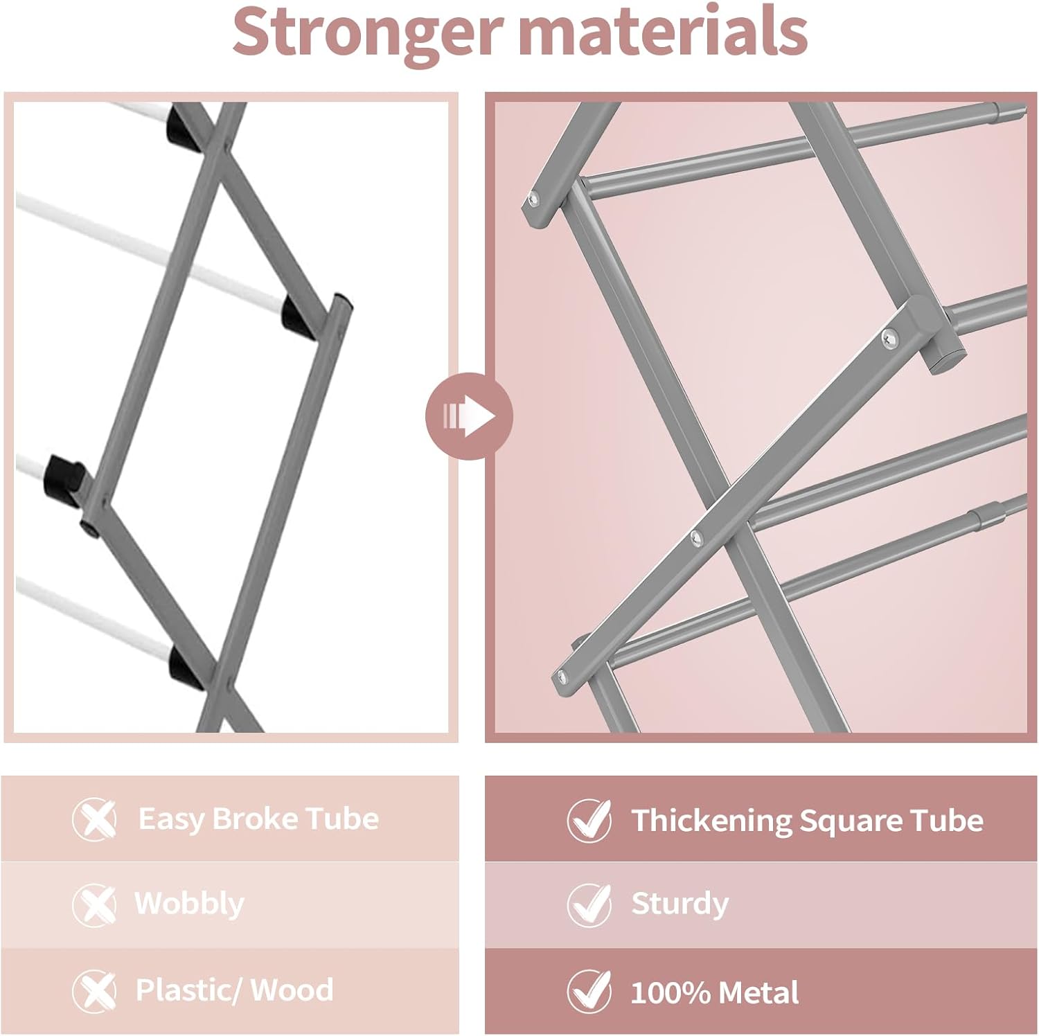 • Material: The clothes drying rack is made of metal and has a rust-resistant coating, which can endure different weathers for indoor and outdoor use, making it perfect for apartments or small spaces.