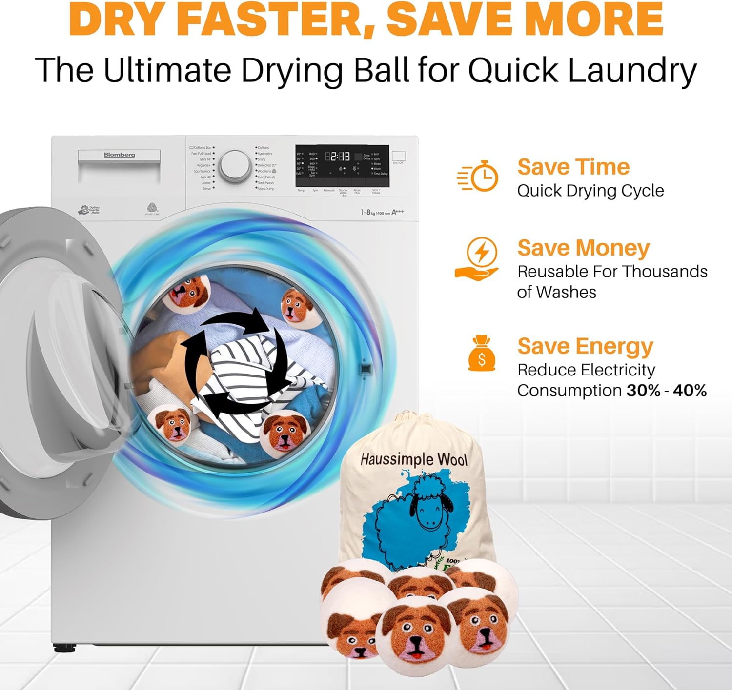 • Reduced Drying Time: Wool dryer balls help to separate and aerate clothes, allowing for better air circulation. This can lead to up to 30-40% faster drying times, which saves energy and reduces electricity costs.