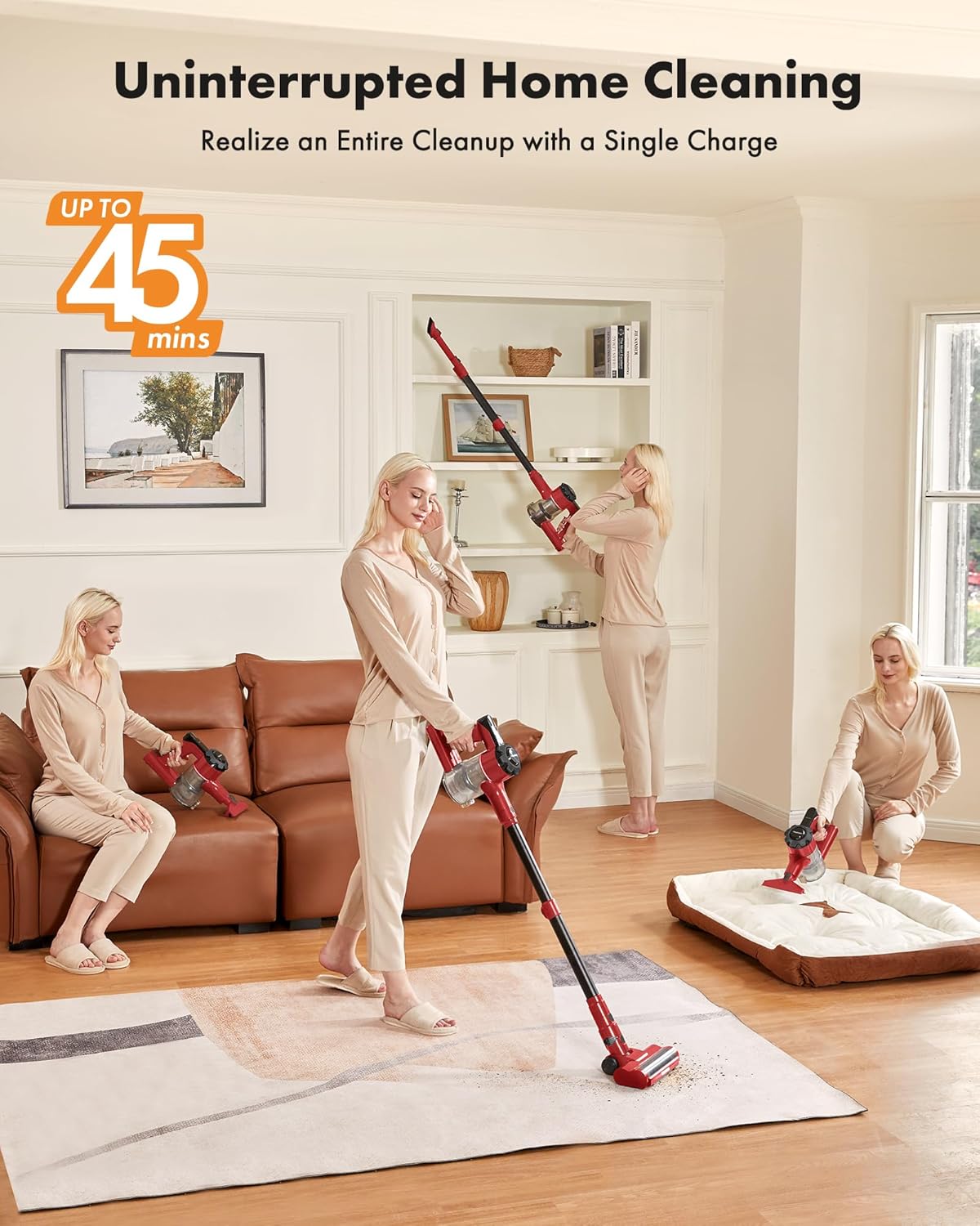 Trucozie Cordless Vacuum Cleaner, 8-in-1 Lightweight Stick Vacuum with 45mins Runtime, Powerful Suction, Rechargeable Cordless Vacuum for Carpet, Tile, Pet Hair, Hardwood Floors, Red
