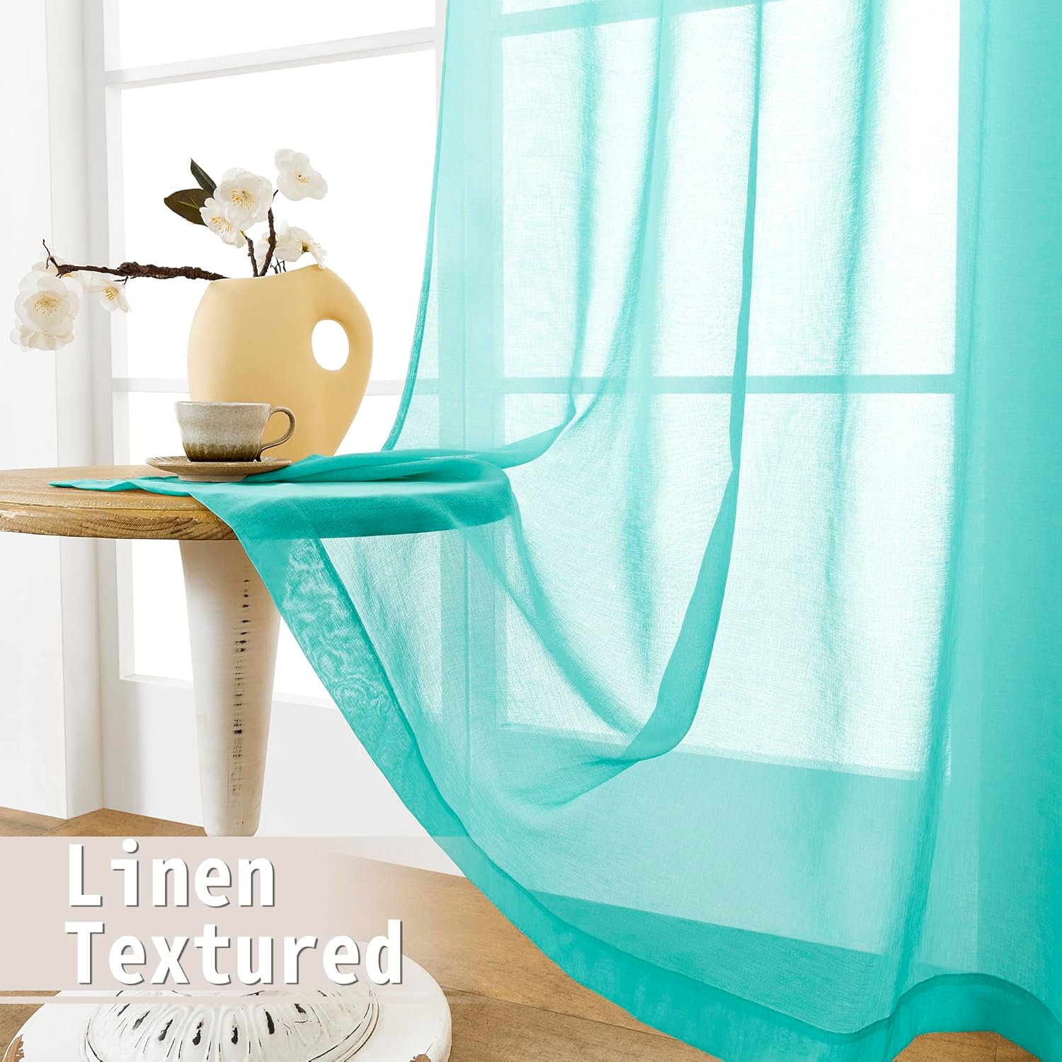 • Light Filtering: The linen look aqua blue door sheer curtain can allow the right amount of natural light through to bring your room a hazy and softer vision, keep you away from someone’s glance from outside and provide you some privacy.