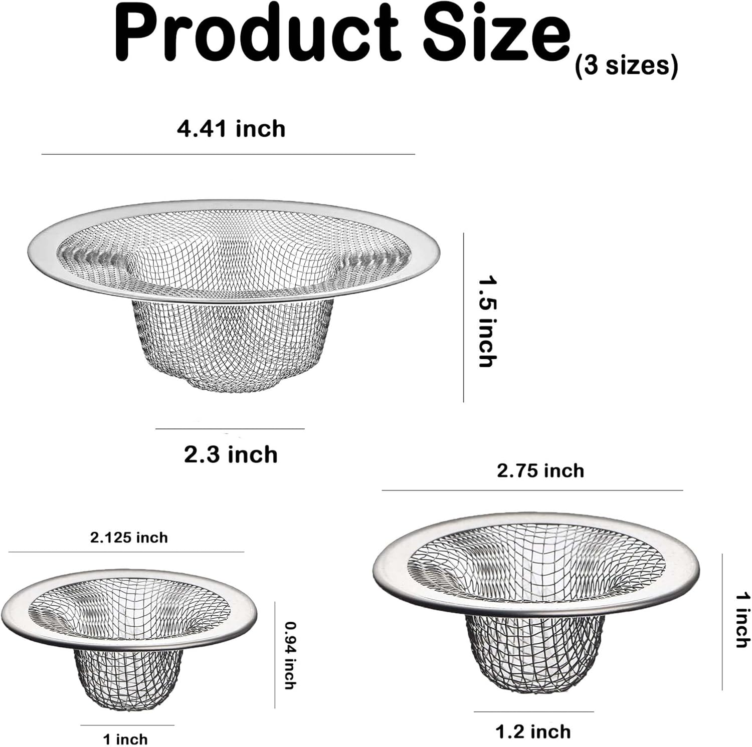 - Set of 15 Metal Mesh Sink Drain Strainers: Bathroom sink and tub mesh drain strainer, small sink strainer bathroom, you will receive 15 pcs metal mesh sink strainers, shower mesh drain covers, whose top diameters are 2.125''(5 pcs), 2.75''(5 pcs) and 4.41''(5 pcs), making them a perfect fit for most bathroom sinks and bathtubs to effectively captures hair and preventing small items from accidentally going down the drain (rings, earrings etc).