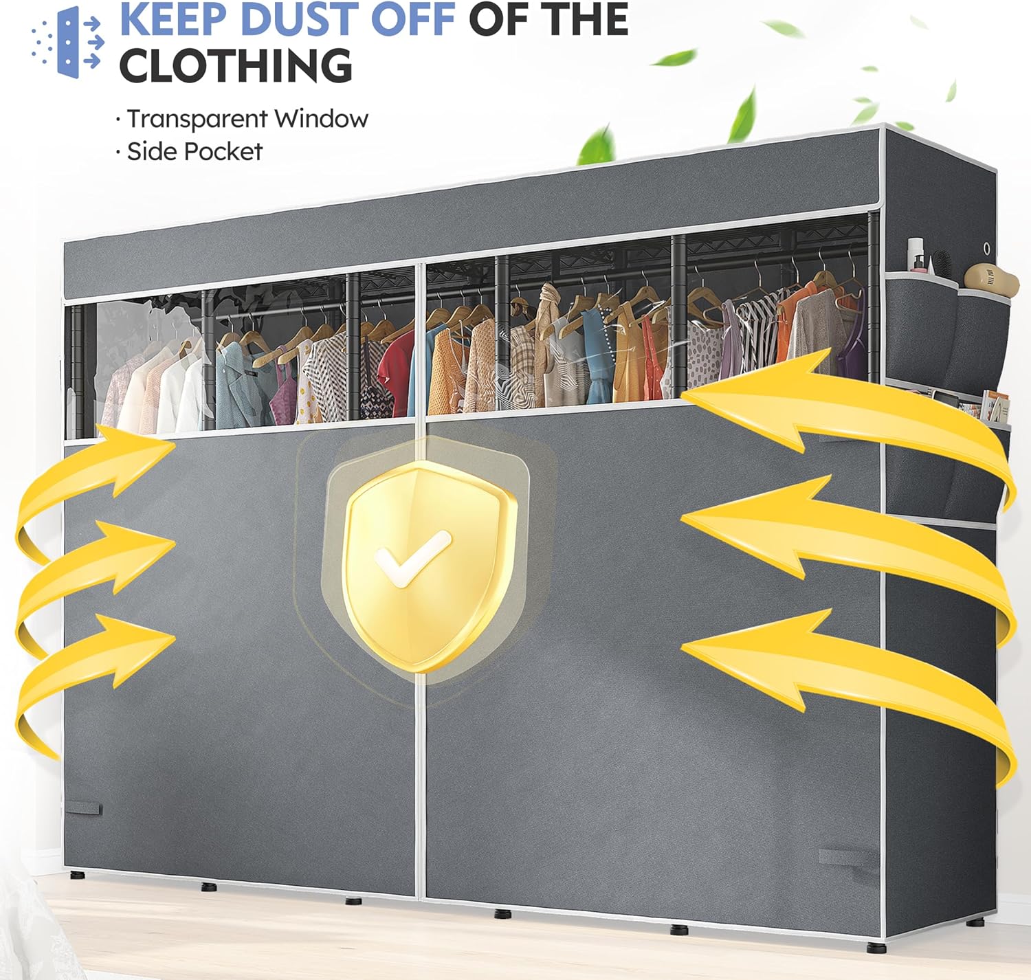 - 【Garment Rack with Zippered Cover】This covered clothing rack comes with zippered oxford fabric cover provides a stylish and protective barrier for clothes, that is easy to clean with damp cloth, the zipper design not only makes store items easy but also keeps items away from dust and moisture-proof and provides more private space while maintaining a neat appearance. 2 Side pockets for storing more sundries. The visible transparent window on the dust cover allows you to quickly determine the hanging position of the clothing and retrieve it