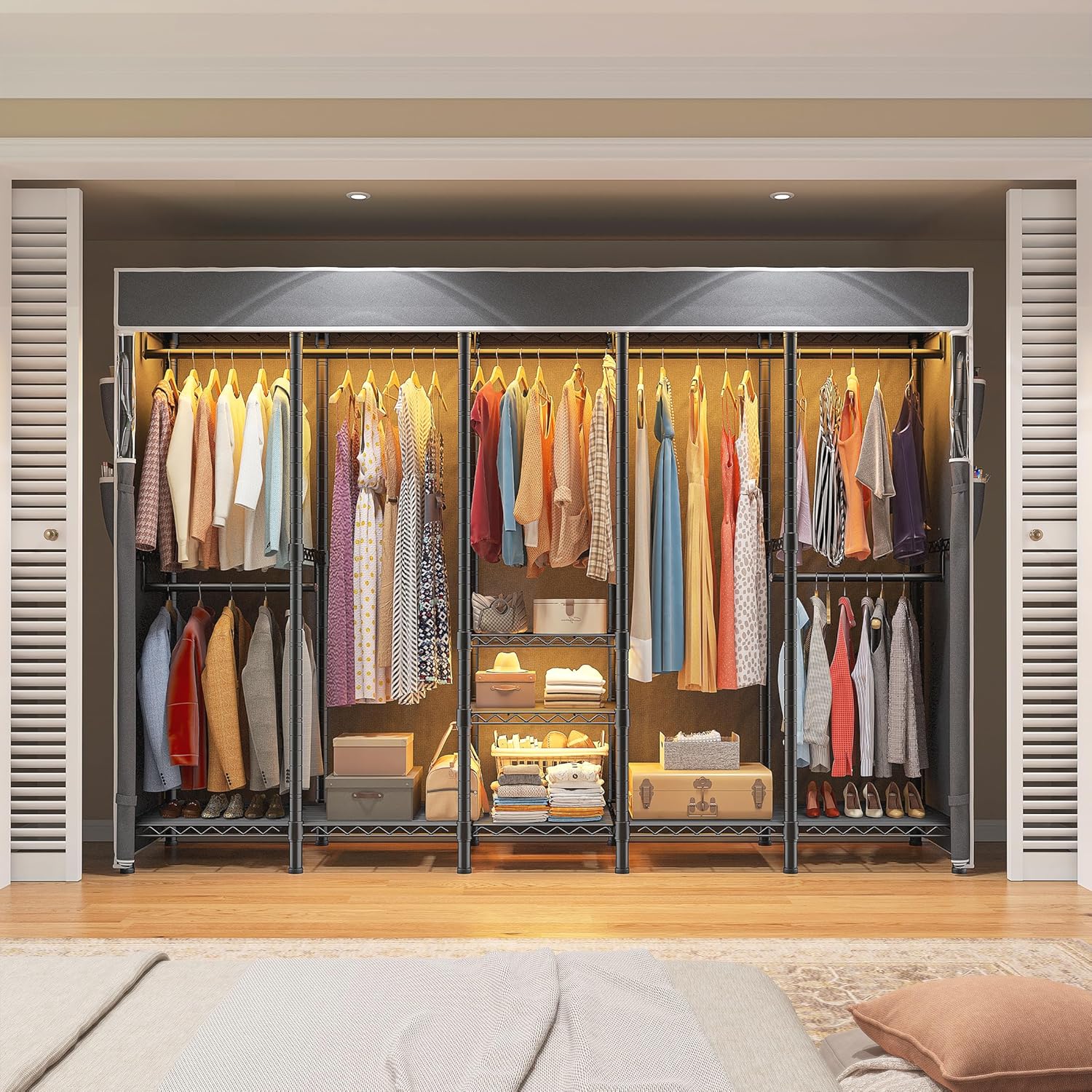 - 【Spacious Wardrobe Compartments】Clothing rack with 5 hanging rods perfect for hanging tops, coats, and sweaters. 8 storage shelves perfect for storage of items such as handbags, hats, quilt and storage box. Wardrobe can hold suitcases and large storage bins at the top, and shoes at the bottom. It adds more storage space for all clothes and accessories and makes home neatly organized