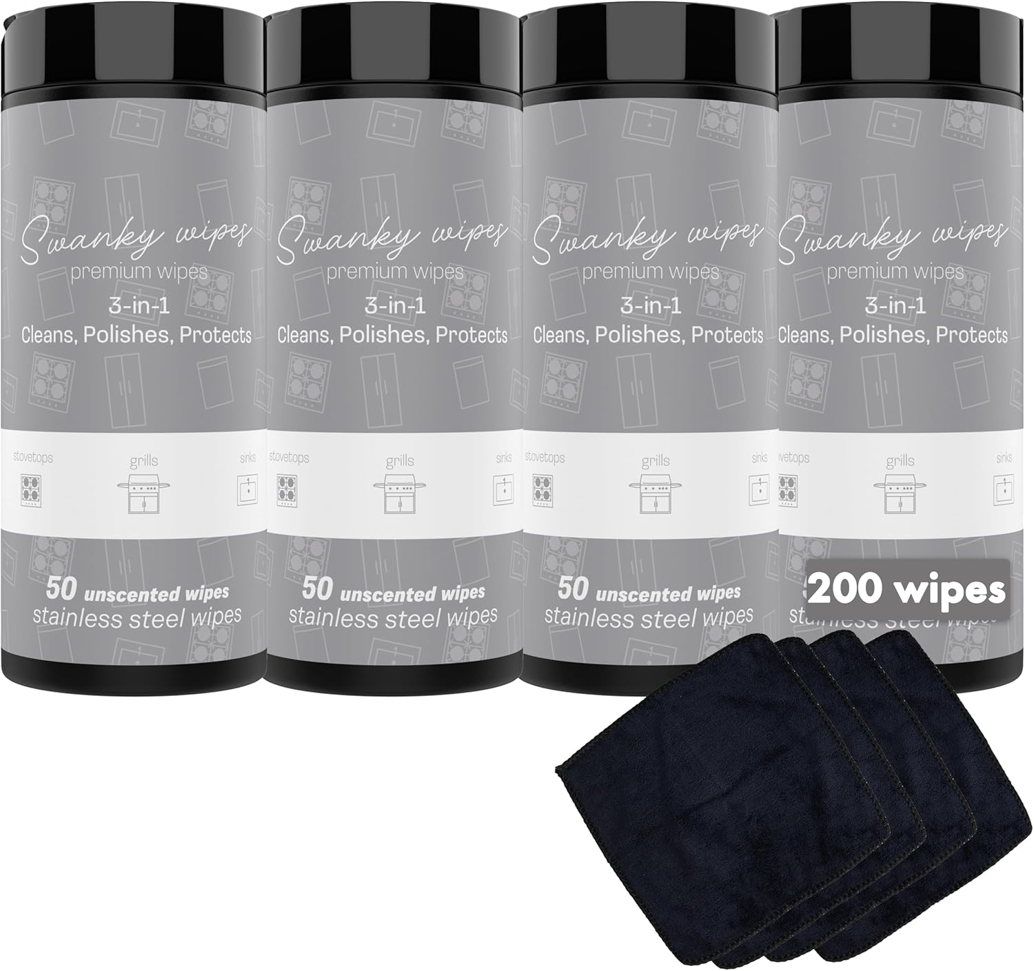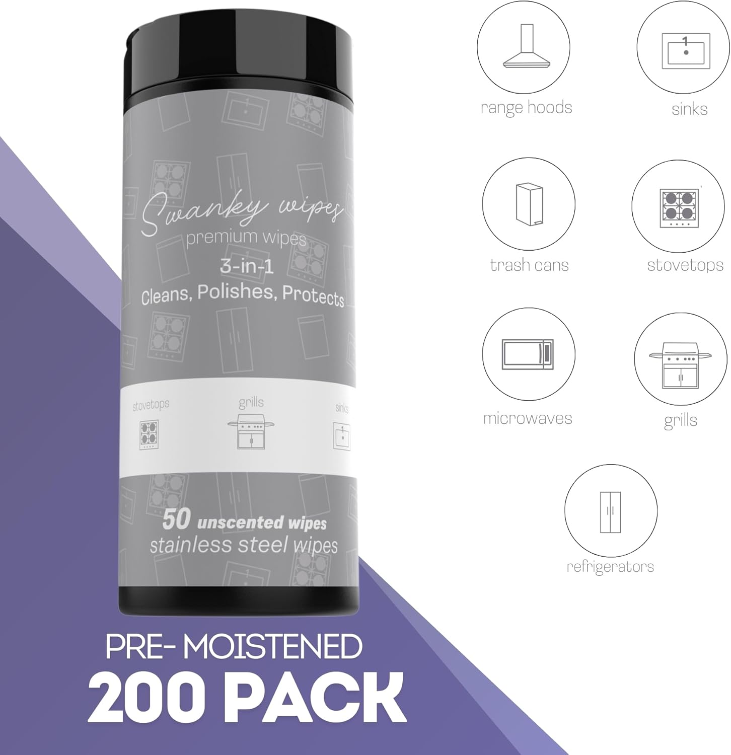 • PRODUCT SPECS - Swanky Stainless Steel Cleaning Wipes come in a pack of 200 soft, non-scratch wipes. Each wipe is pre-moistened and ready to use, making them a convenient addition to your cleaning supplies. Ideal for keeping your stainless steel appliances looking polished and clean.