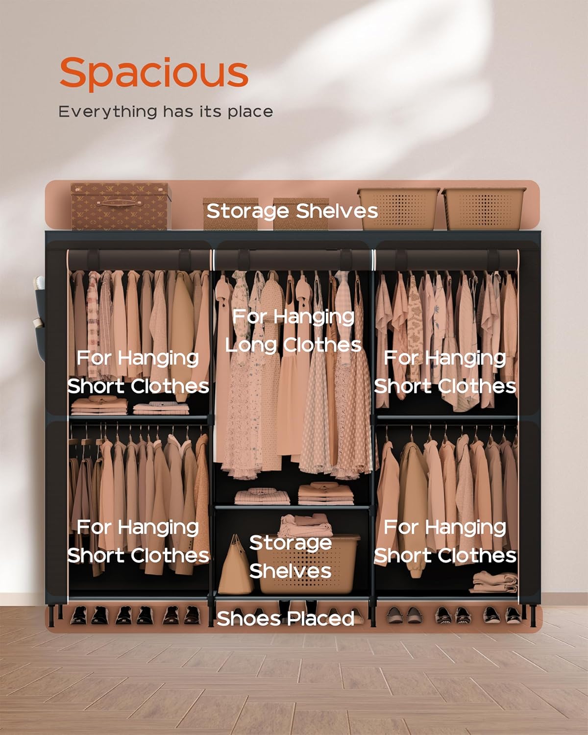 • [Versatile Storage Areas] This closet has 4 areas for hanging short clothes and 1 area for hanging long clothes, as well as multiple shelves for folded clothes. The top area of the wardrobe can holds storage boxes, bags and other items, and the space under the bottom shelf for shoes; maximize your storage needs.
