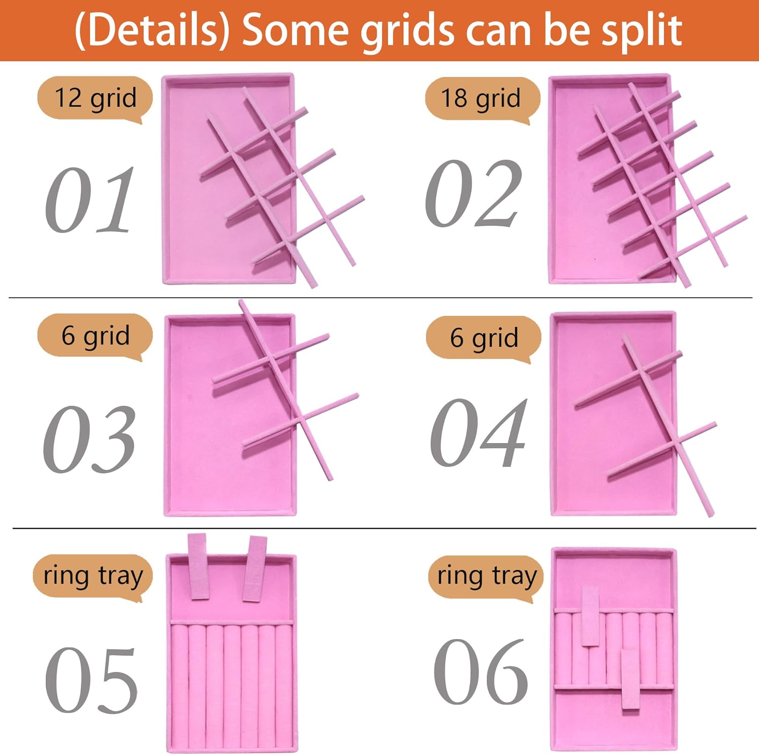 • Adjustable Dividers and Stackable Design: Provided with removable grids, easy to remove to fit for your different size jewelry. Our jewelry trays can be stacked. Keep your jewelry organized and easily accessible