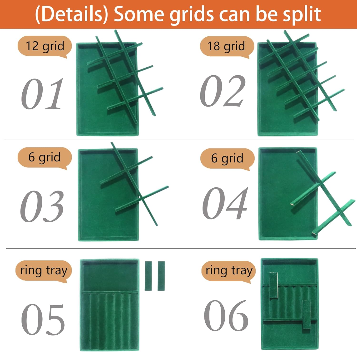 • Adjustable Dividers and Stackable Design: Provided with removable grids, easy to remove to fit for your different size jewelry. Our jewelry trays can be stacked. Keep your jewelry organized and easily accessible