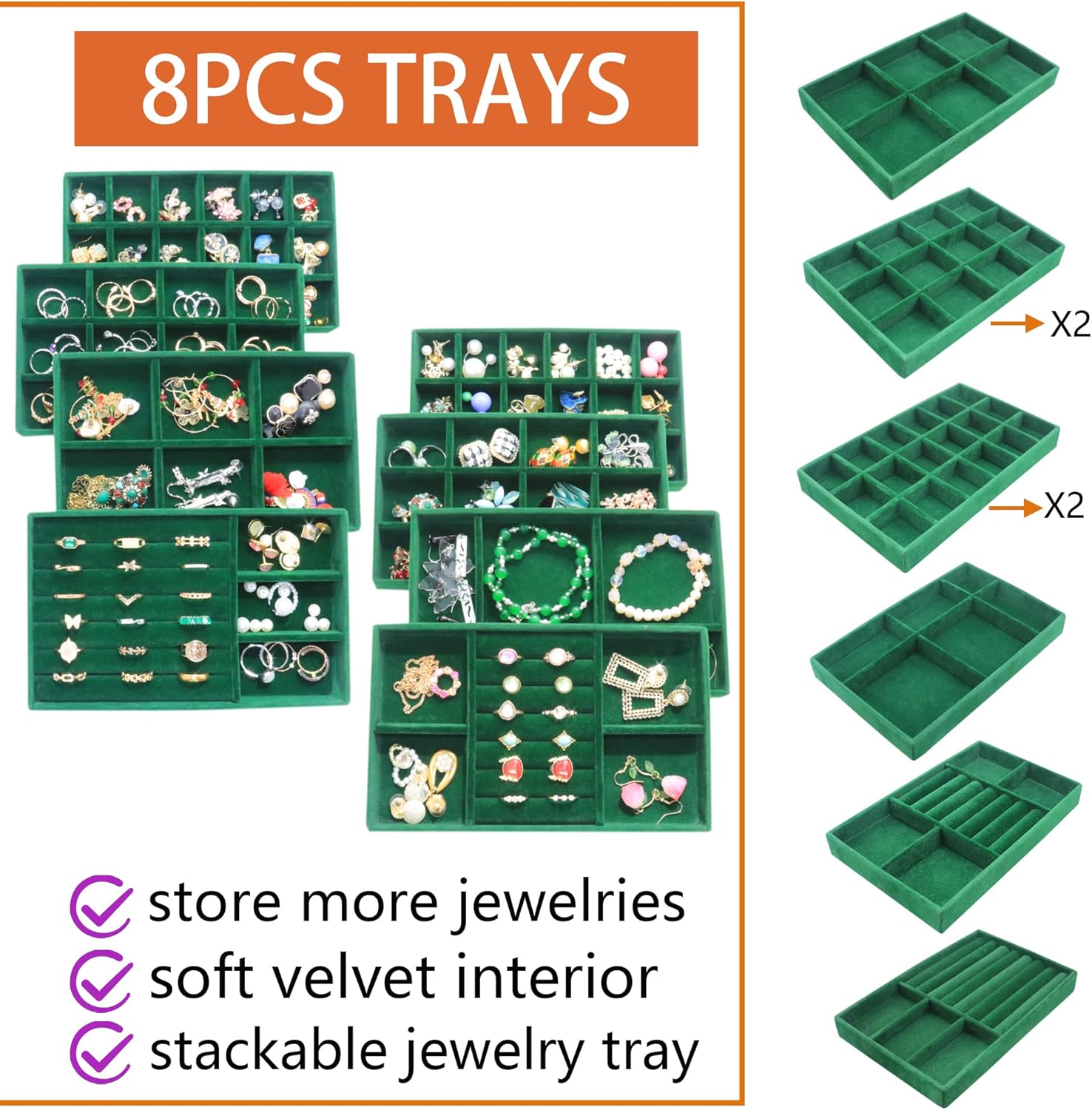 • Perfect Size for Any Drawer or Table: Set of 8 jewelry trays ( Each 8.2 " x 5 " x 1"). Convenient and roomy enough for you to store your different jewelry, like earrings,bracelets, necklaces, rings, pins, brooches,watches and so on