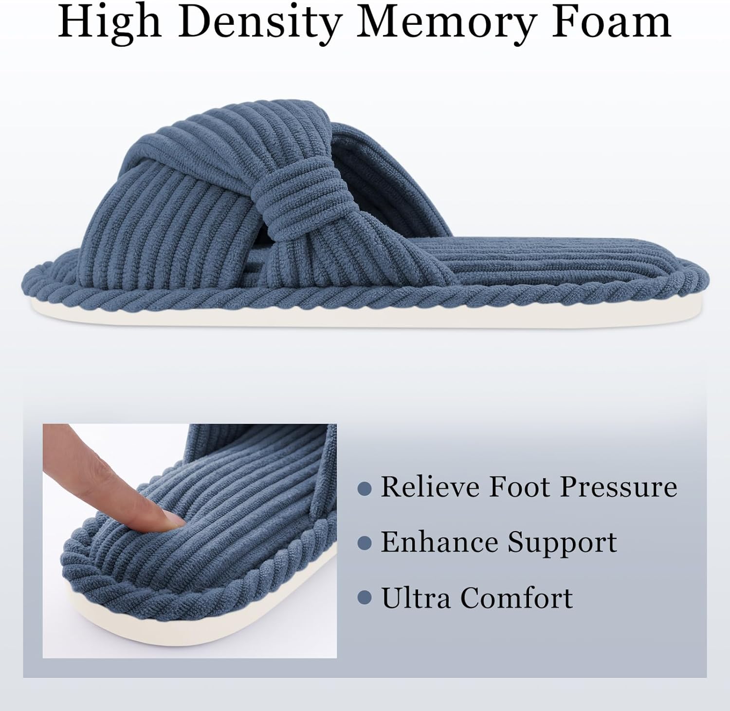 Evshine Summer House Slippers for Women Corduroy Cross Bow Indoor Slippers Open Toe Slip On Bedroom Shoes with Memory Foam
