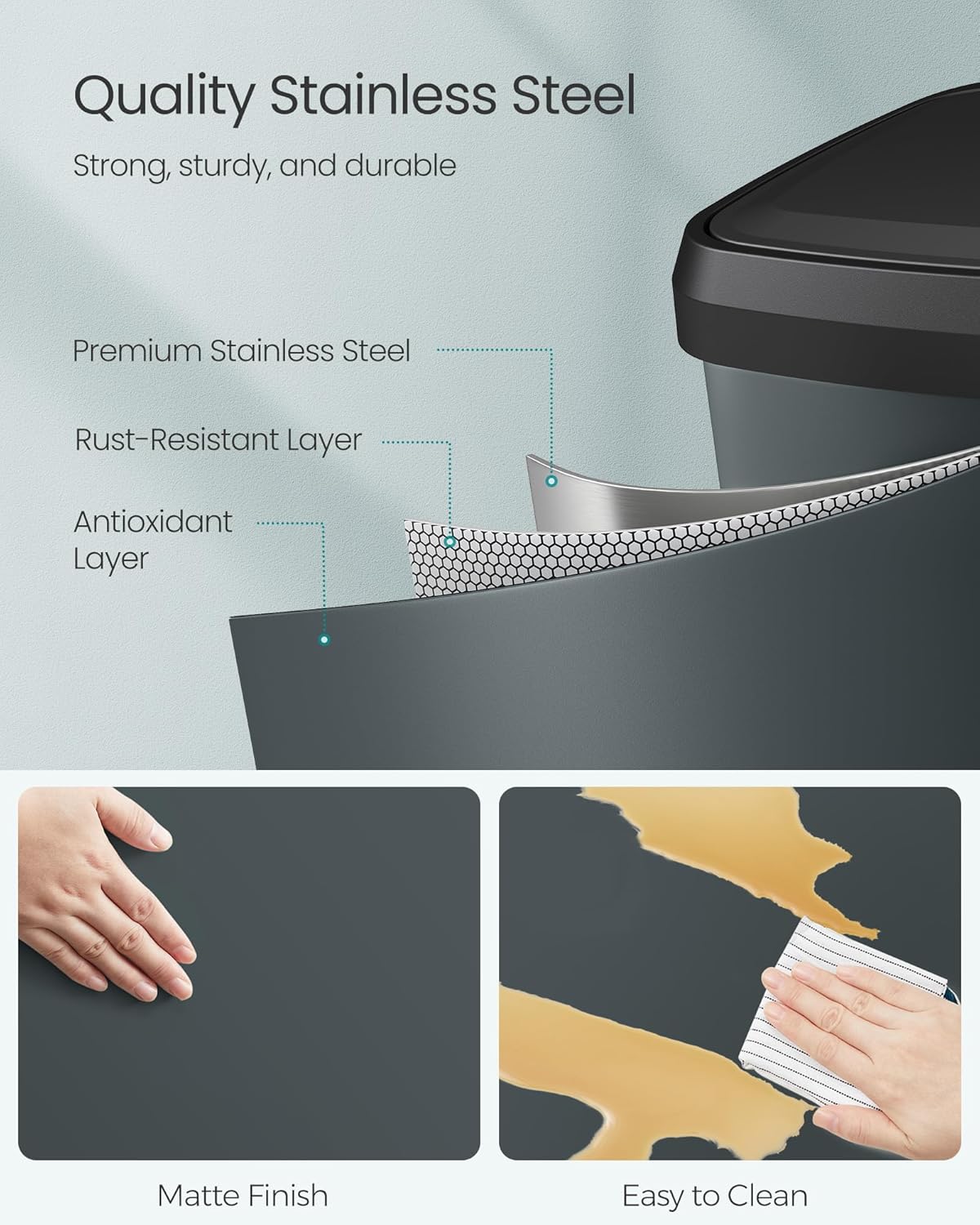 • [Quality Stainless Steel] Made from stainless steel, this trash can is rust-resistant and easy to clean. It adds a stylish modern touch to any kitchen