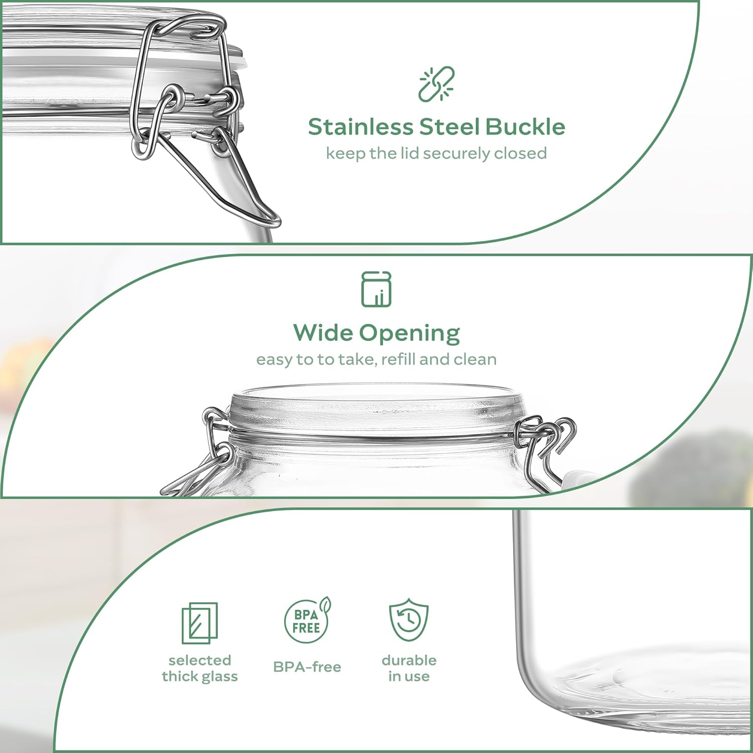 • Wide Applications: Our airtight storage jars are very versatile and can be used not only to store a wide variety of foods such as pasta, coffee beans, cookies, candy and spices, but also to pickle your own fruits and vegetables