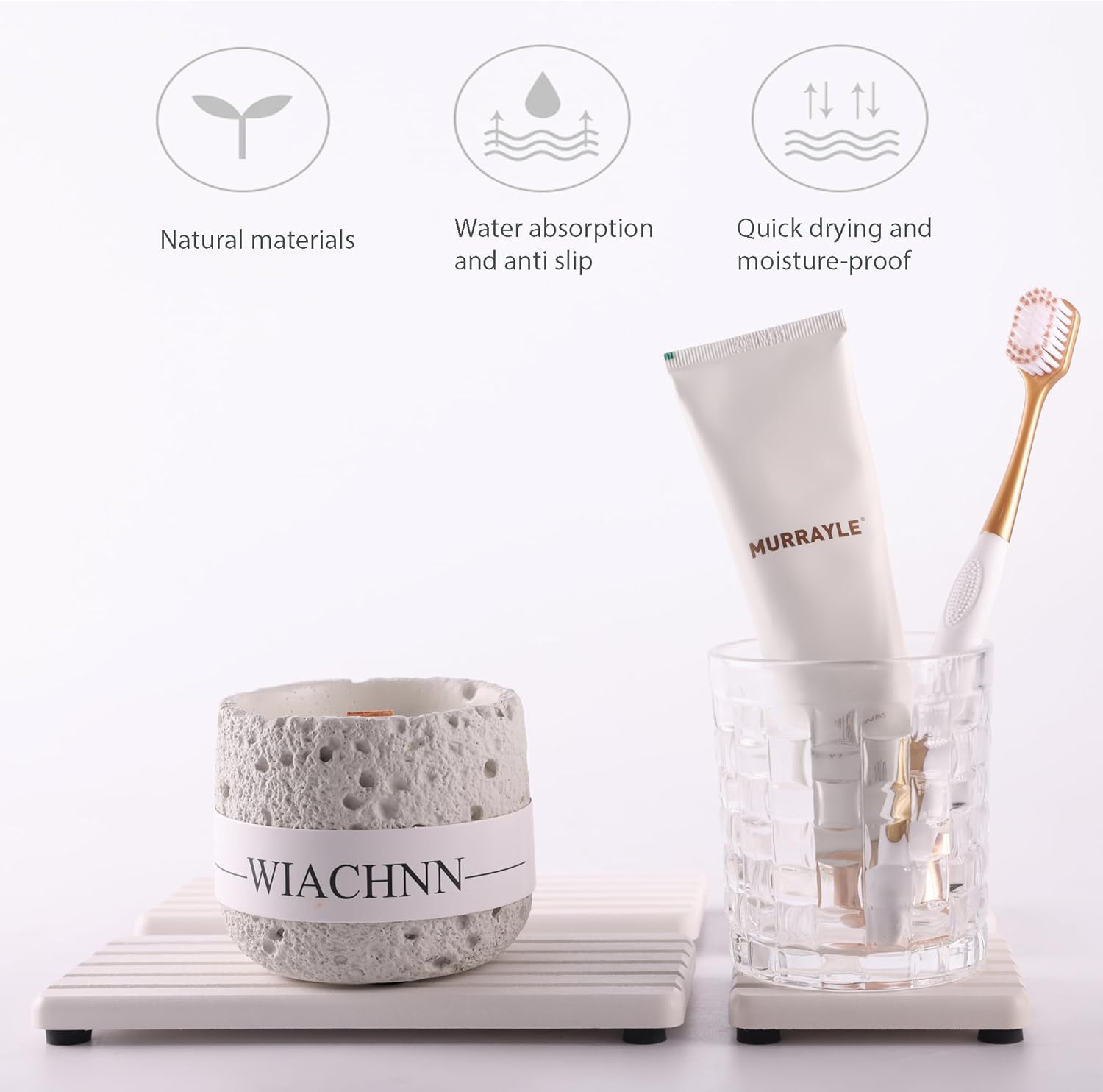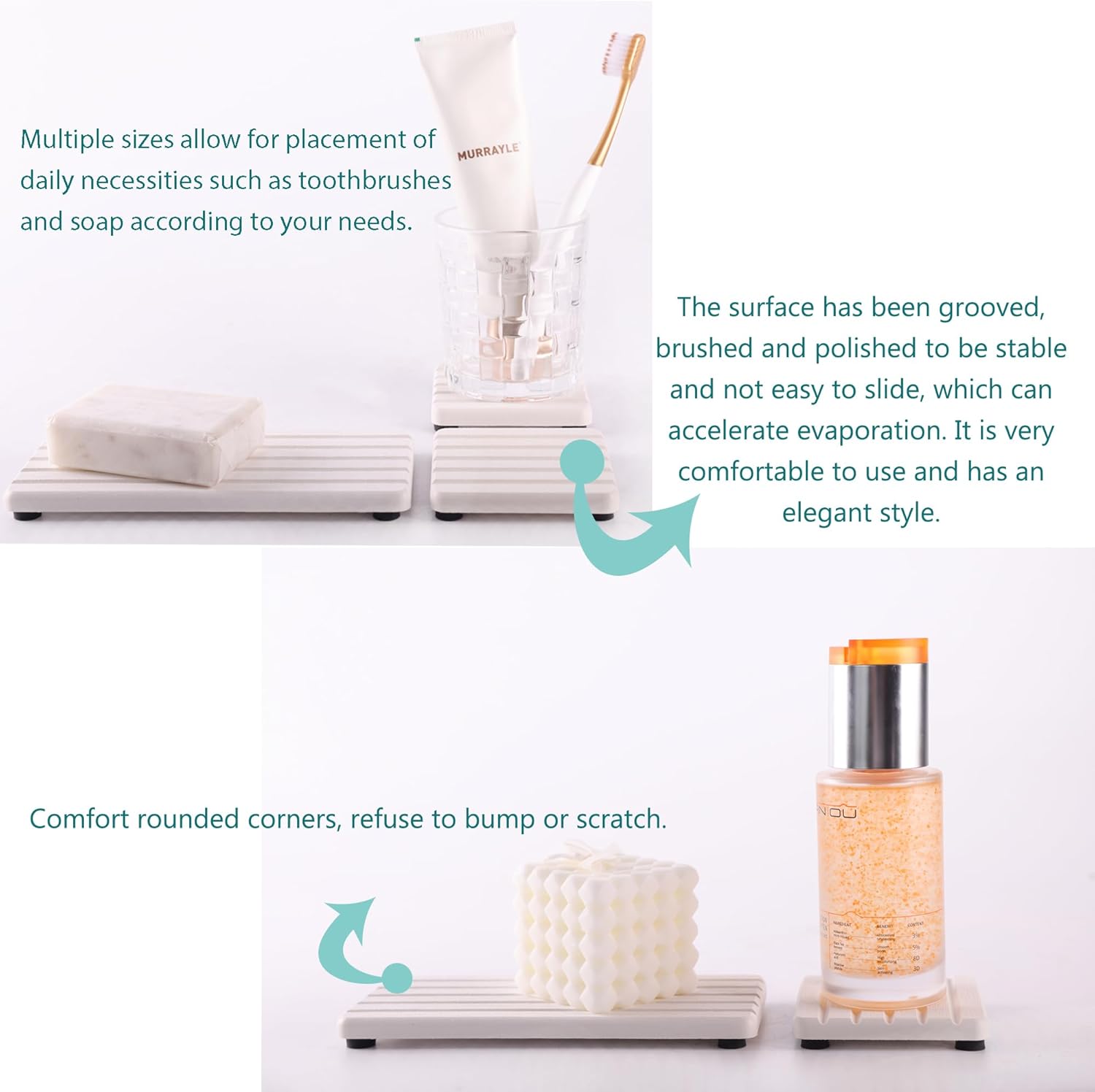 • Striped ditch design speeds up the absorption and volatilization of water, and has anti-skid effect.Silicone footpads boost the slip-resistance of coasters while keeping them out of the bathroom vanity. This design improves the contact surface between the diatomaceous earth coaster and the air, prevents moisture, and prolongs the service life of the product.
