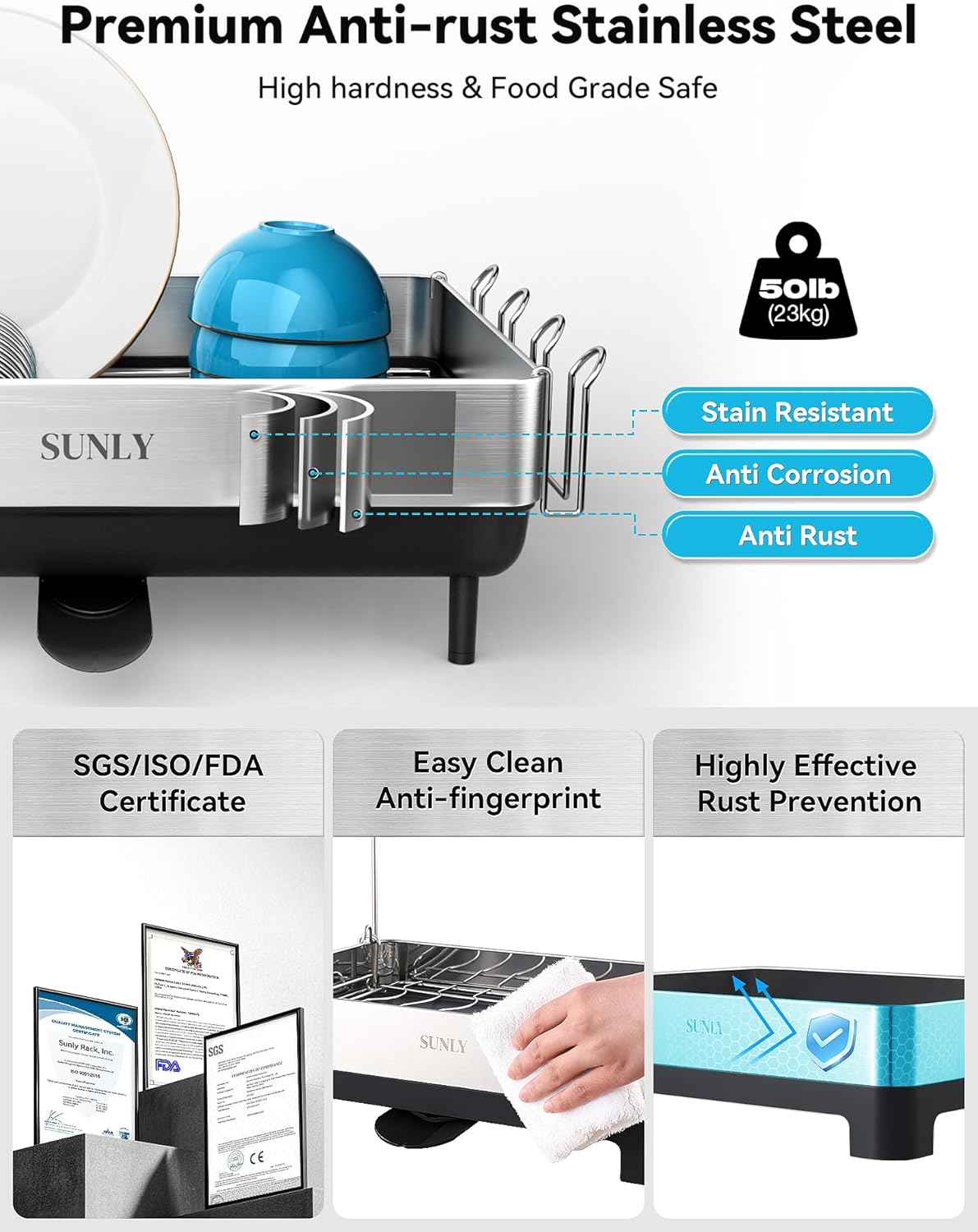 - [Premium Anti-Rust 304 Stainless Steel]: The dish rack is crafted from high-quality brushed stainless steel and passes a 72-hour salt spray test to ensure rust-proof durability. Its sleek, fingerprint-resistant finish makes it easy to clean, providing a sturdy, low-maintenance solution