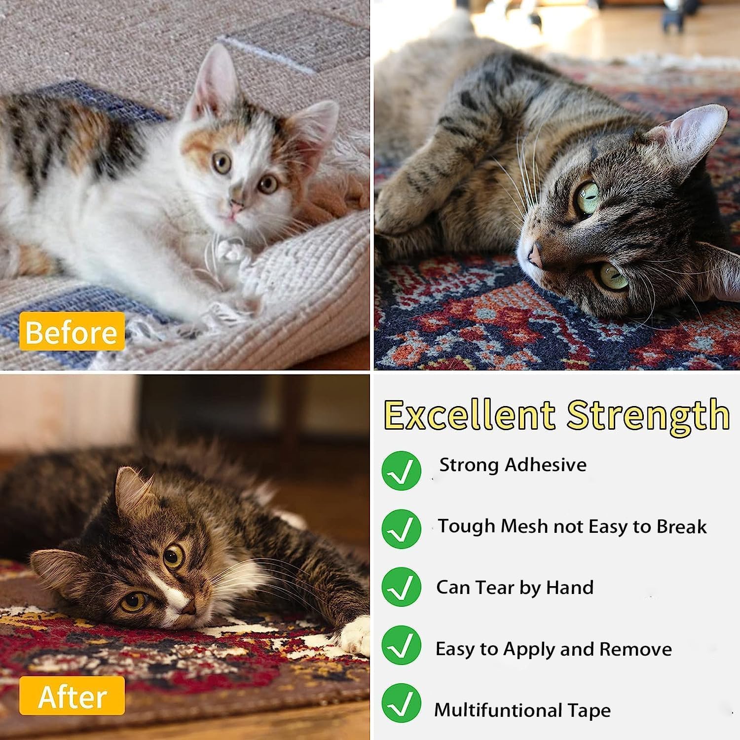 - RESIDUE FREE, EASY TO CLEAN- Double sided mesh tape coats high adhesion glue to strong fiber grid, leaves no annoying glue or residue when taking it off. The adhesive will not peel back up, causes no trouble in cleaning. Strong double sided tape keeps carpets or other objects firmly held in place. If you need to pull up clear carpet tape to reposition it or clean up, removable rug tape is very easy to be taken off.