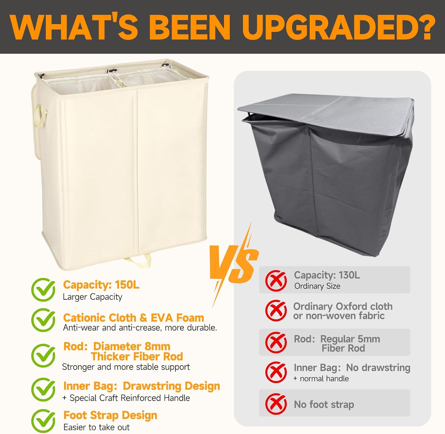 - 【Size Upgrade】The double compartment clothes basket measures 24x 13.4 x 28in with a huge capacity of 150L, which can hold 4 loads of laundry, and each compartment is 75L which can hold 2 loads of laundry individually