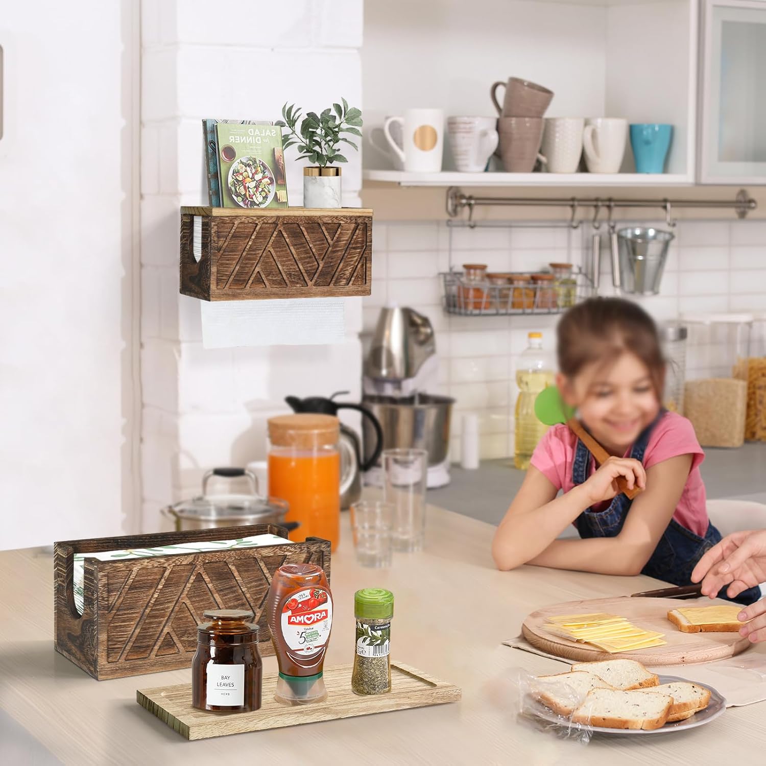 - ✨【Sturdy & Durable Paper Towel Dispenser】This farmhouse paper towel holder wall mounted is built with excellent quality 100% natural solid wood. Food grade safety coating, harmless and odor-free, safety enough to store c-fold, z-fold, trifold hand towel, paper towel, napkin for kitchen, bathroom and living room. Our utensil holder organizer is durable and will last for a lifetime.