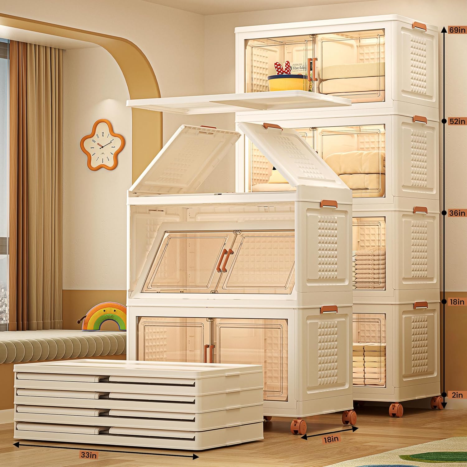 752QT/188Gal 4 Layers Stackable Storage Bins with Lid & Doors - Sensor Lights in Cabinets, Large Collapsible Container Box with 6 Wheels, Plastic Foldable Organizer for Home