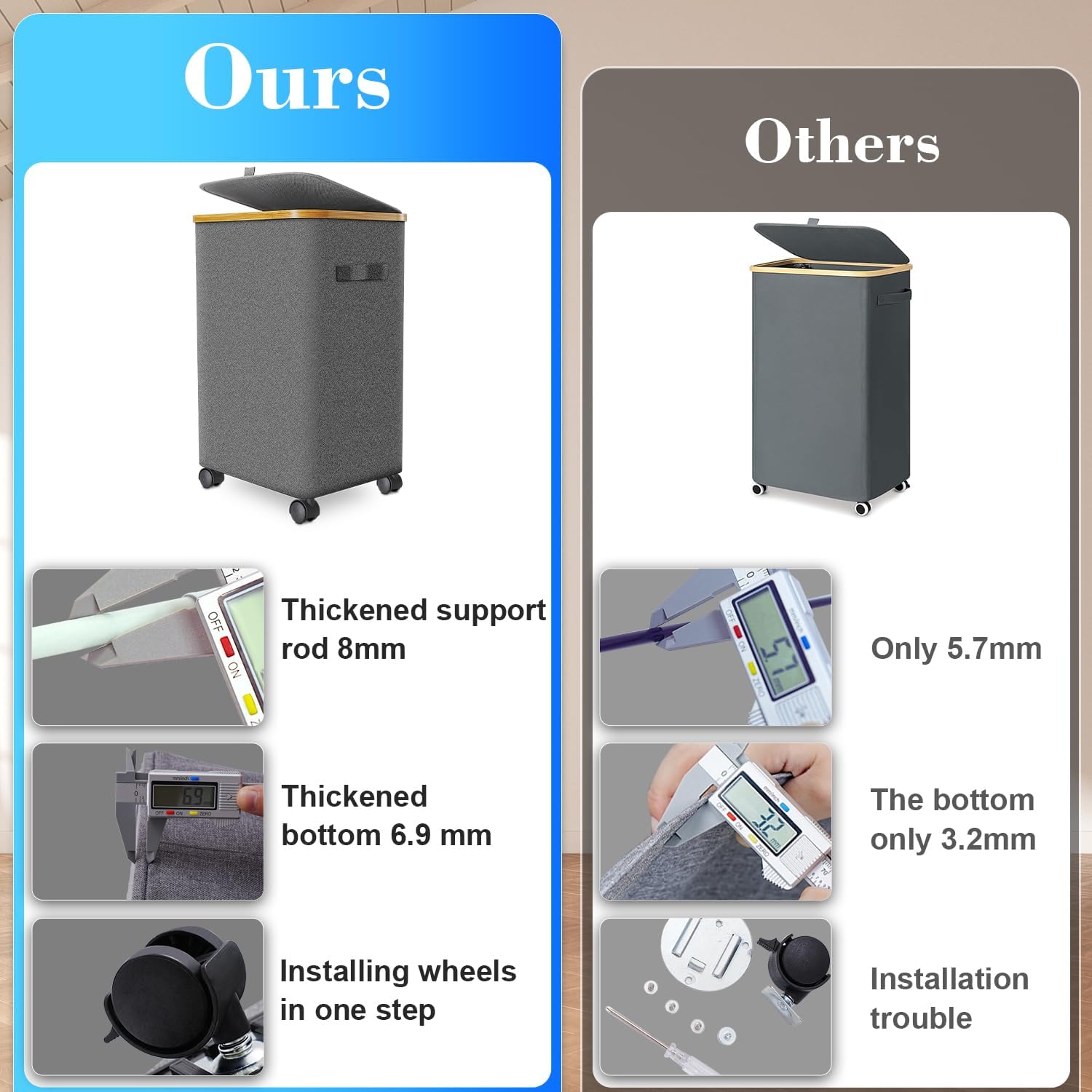 Laundry Hamper with Wheels,20 Gal (75L) Laundry Basket with lid Rolling Clothes Hamper Foldable Dirty Clothes Basket on wheels with Bamboo Frame and Bag for Bedroom, Dorm, Laundry Room-Grey