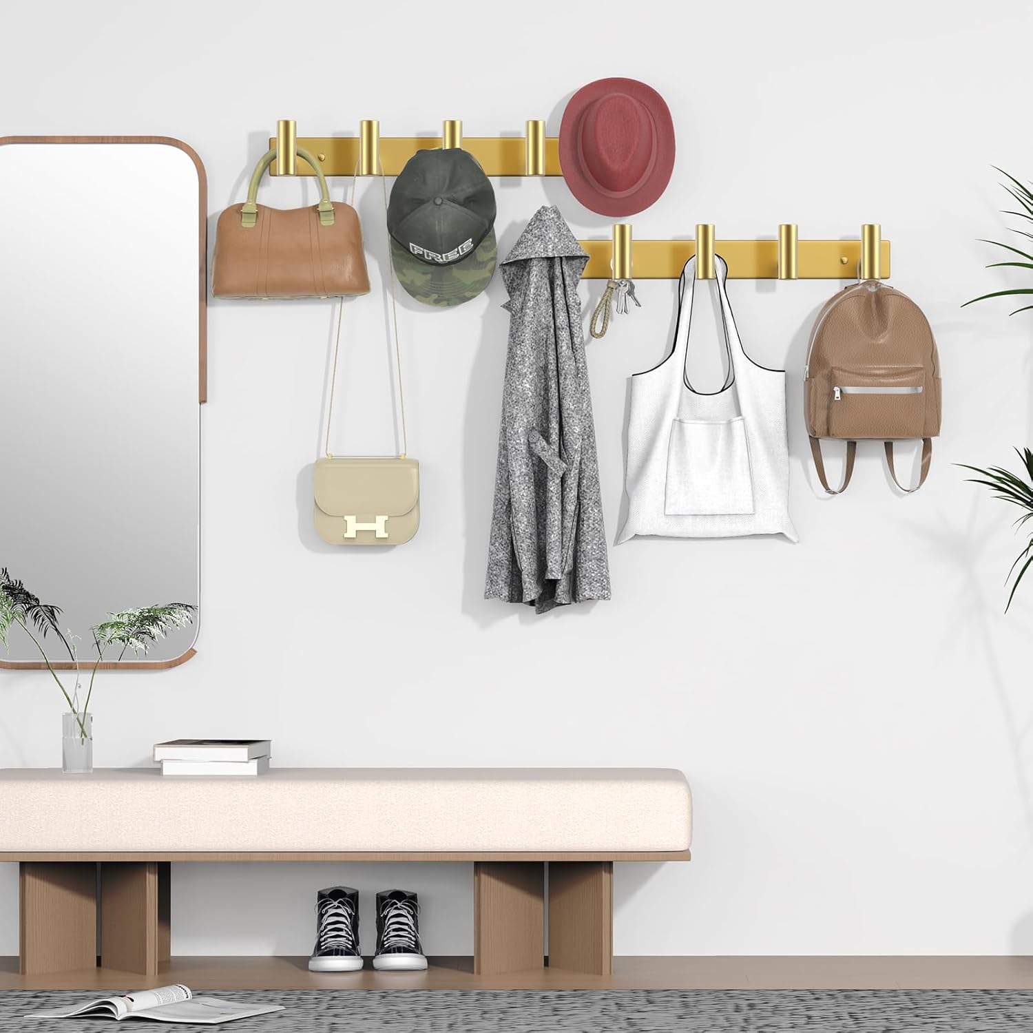 • Versatile Use: This Gold Row Hook Coat Rack for various locations, including bathrooms, kitchens, living rooms, entrances, and offices. Use it to hang towels, kitchenware, coats, hats, jackets, wallets, keys, and more, adding functionality and organization to your space.