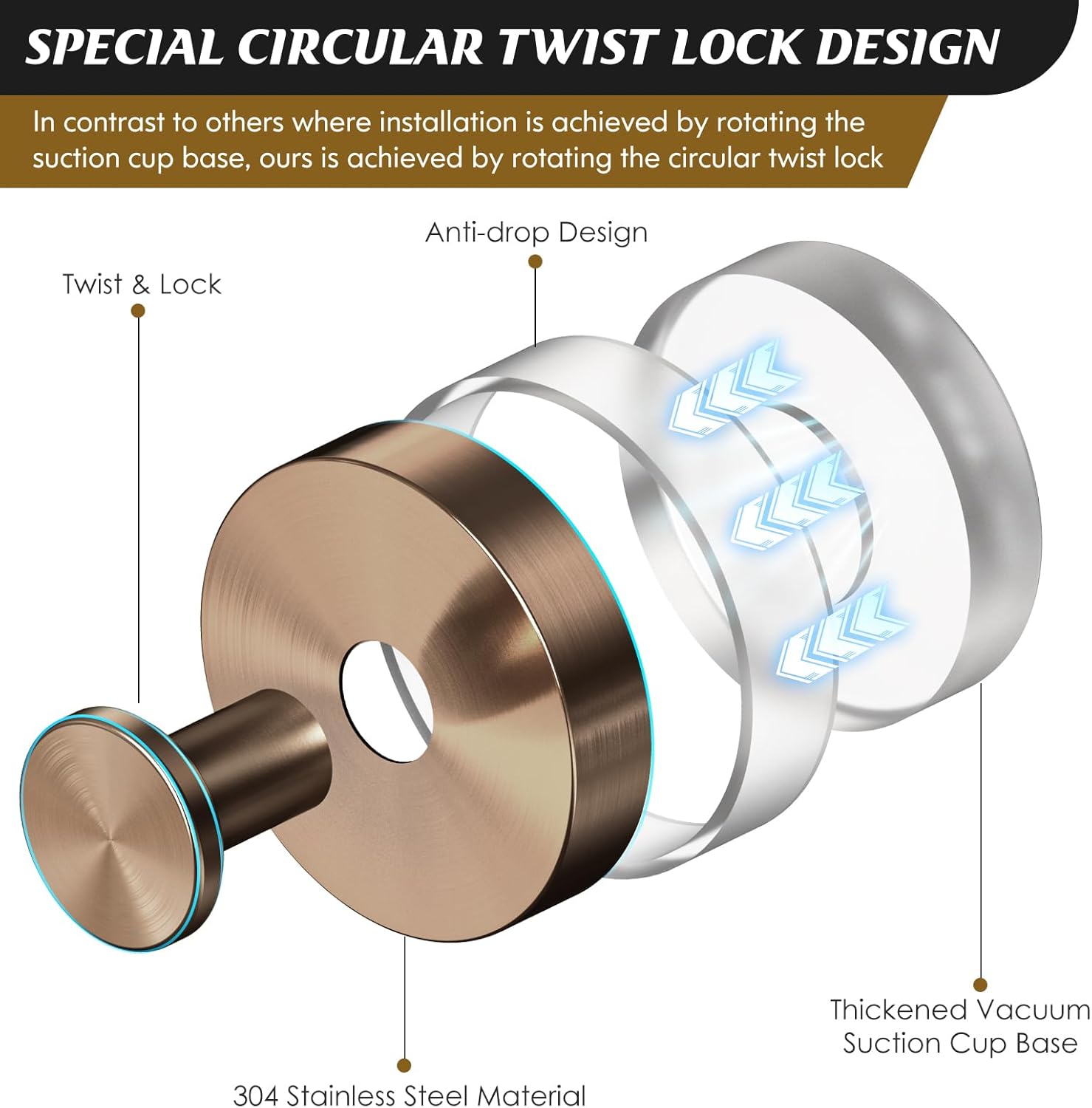 Suction Cup Hooks for Shower,2Pcs Shower Towel Suction Hooks,No Drill Towel Hooks for Bathroom Wall,Kitchen,Glass,Mirror,Tile to Hang Towels,Robes,Loofah-Champagne Bronze