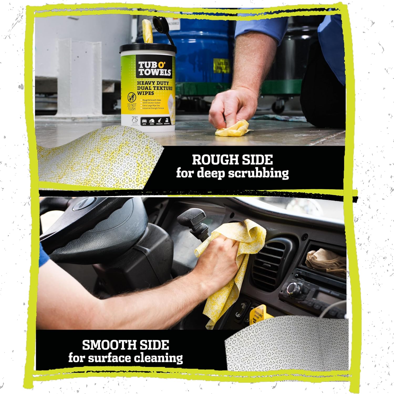 Tub O’ Towels TW75 Heavy-Duty 10" x 12" Size Multi-Surface Cleaning Wipes, Dual Texture, 75 Count Per Canister, 2 Pack