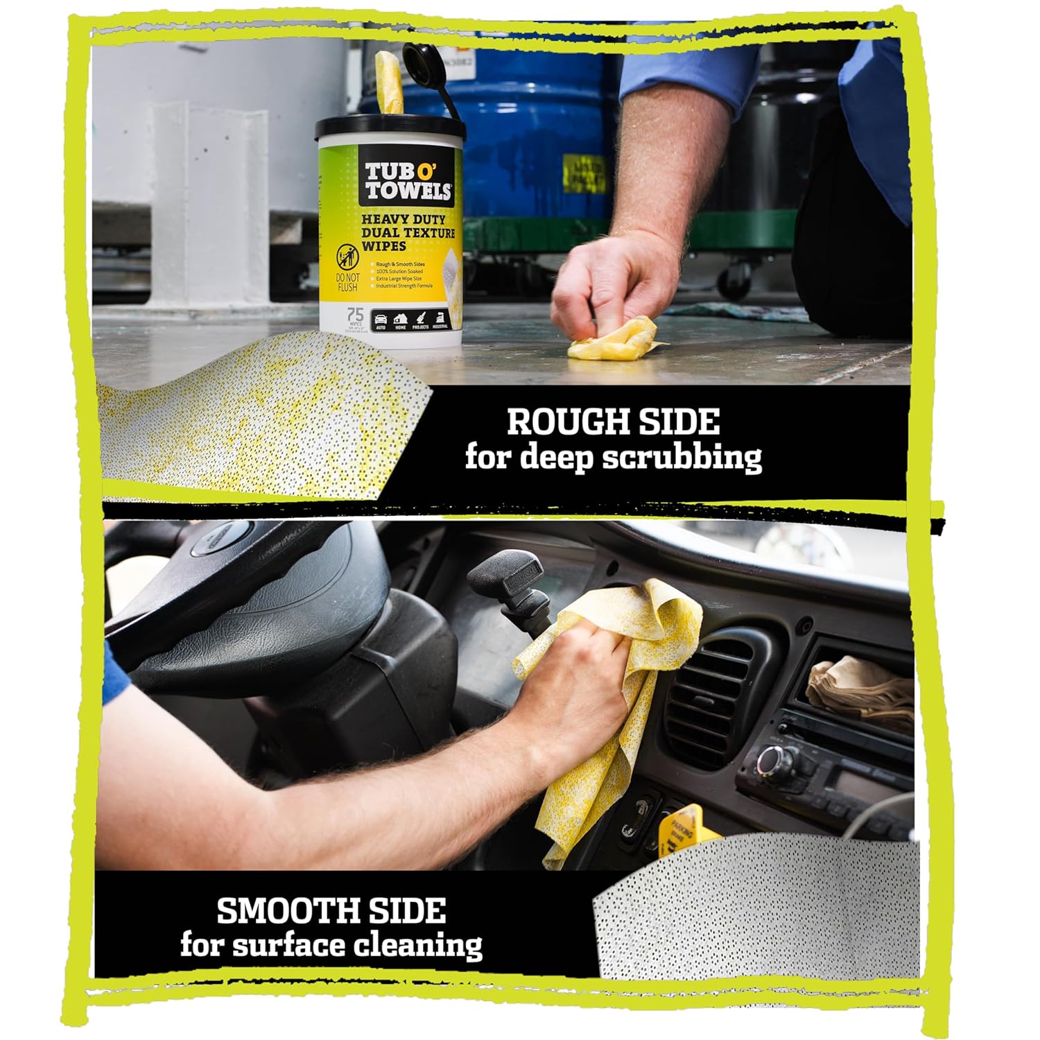 Tub O’ Towels TW75 Heavy-Duty 10" x 12" Size Multi-Surface Cleaning Wipes, Dual Texture, 75 Count Per Canister, 6 Pack