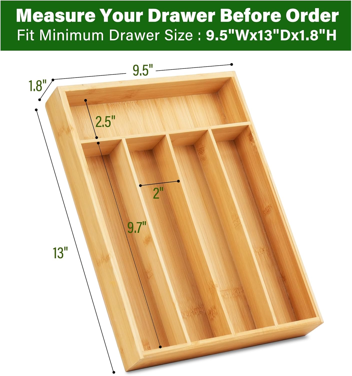 • Solid Bamboo: Our silverware tray is made of 100% bamboo, no MDF, odor-resistant, does not crack or warp easily; smooth surface, corners & edges