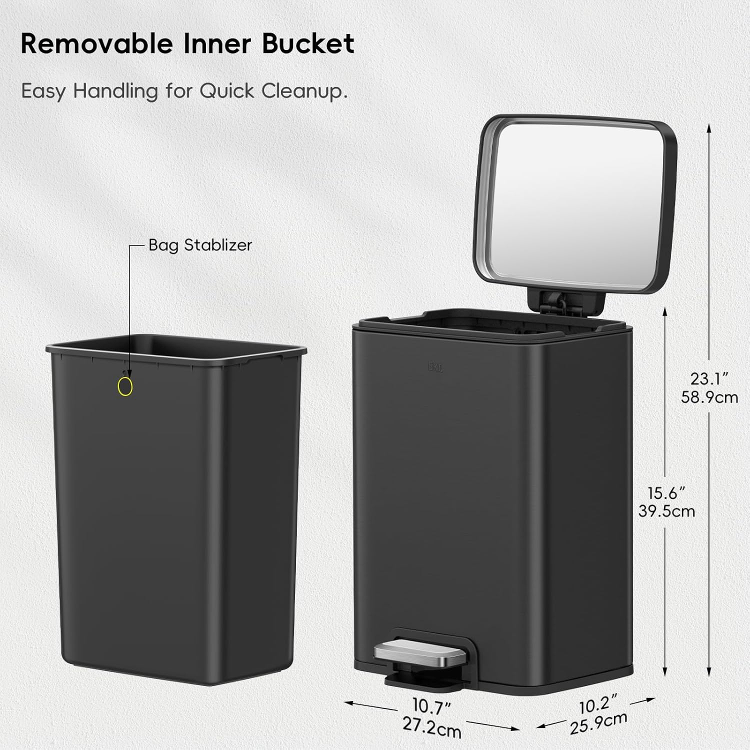 • ANTI-RUST & FINGERPRINT RESISTANT: The stainless steel body resists rust and fingerprints, keeping your trash bin looking new. Easily maintain its cleanliness with just water and a cloth.