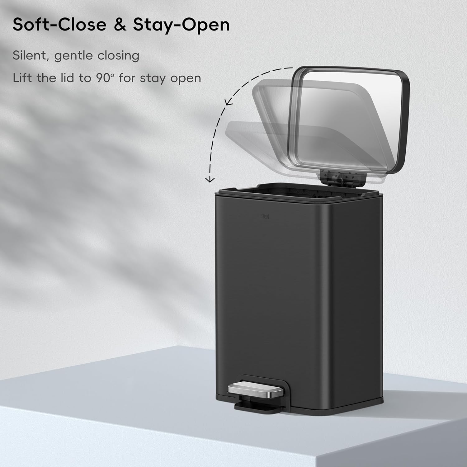 • SOFT CLOSE & STAY-OPEN LID: Enjoy the convenience of a lid that opens and closes smoothly and silently with a simple push of the pedal. The lid can also stay open at a 90° angle as long as you need, making disposal tasks easier.