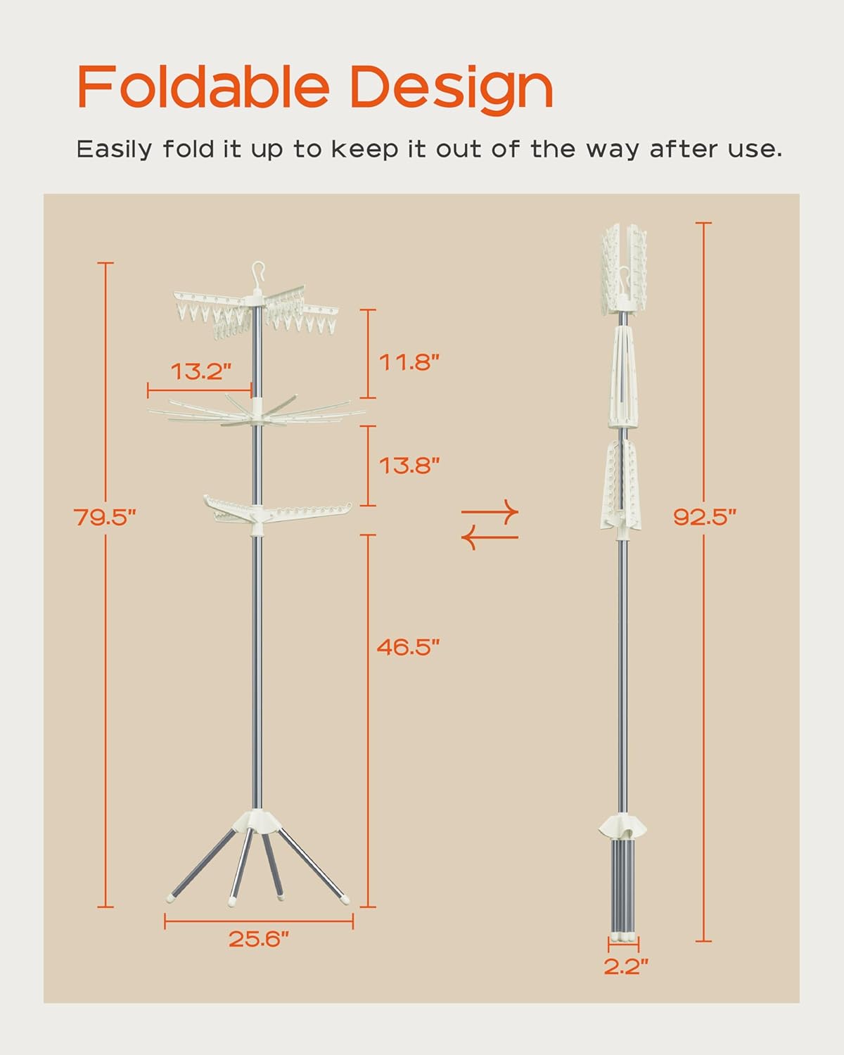 • [Foldable and Space-Saving] This vertical drying rack measures 25.6”D x 25.6”W x 79.5”H and takes up very little space. After use, simply fold the four legs and three drying rods into a smaller size: 2.2 "D x 2.2 "W x 92.5"H, which can be leaned against the footrest, perfect for apartment laundry rooms or narrow spaces and corners.