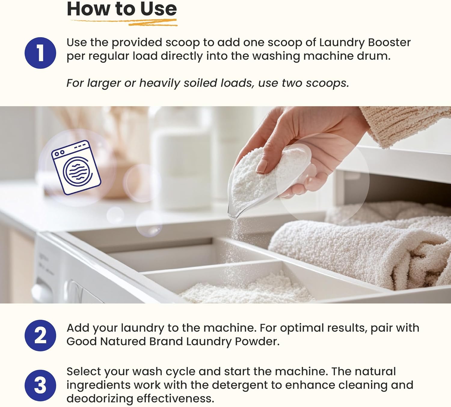 • How To Use: Add one scoop directly into the washing machine drum for a regular load, using the provided scoop. For larger or heavily soiled loads, use two scoops. Add your laundry to the machine. For best results, pair with Good Natured Brand Laundry Powder. Choose your wash cycle and start the machine.