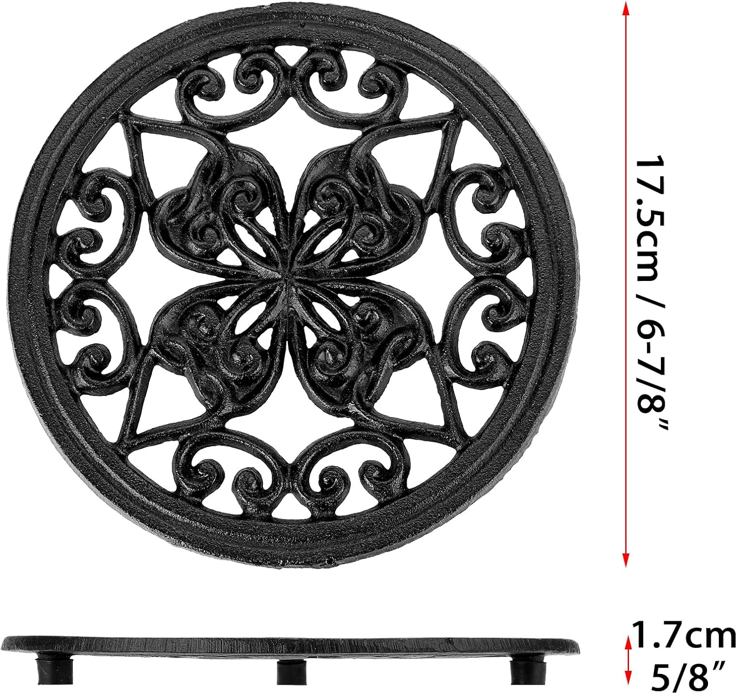 • Antique cast iron trivets measures about 17.5cm / 6-7/8" in diameter and 1.7cm / 5/8" in height, making it perfect for countertop use