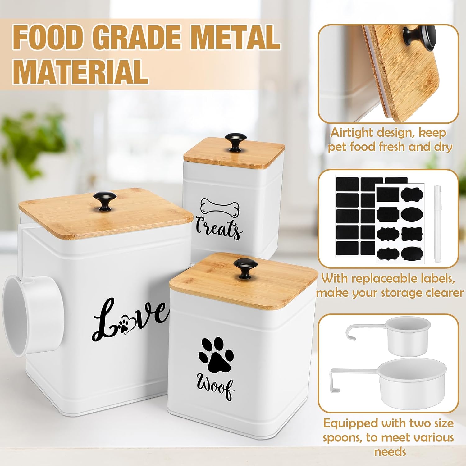 • Practical Design: airtight bamboo lid keep pet food fresh and dry, and make sure that treats are easy to access for you yet sealed for your pet; The jar set is equipped with two size spoons, meet your various needs, such as dry and wet food separation; And the set comes with replaceable DIY labels, make your storage clearer