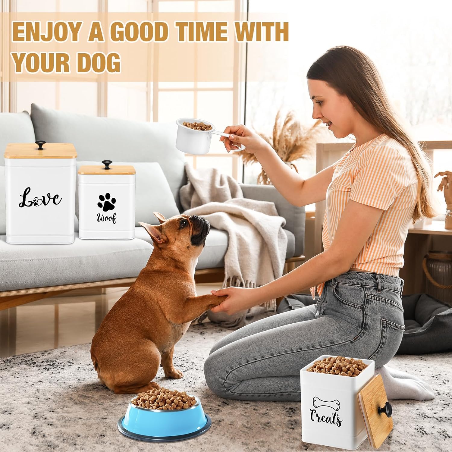 • Versatility: these cute design dog food tins are nice for your kitchen, office, pet station, console table or anywhere; The small size dog snacks jar in the set is easier to carry, you can take it out to play with your pet; Each container is suitable for dog cookie, bone, dry or wet food, snack, teething stick, or treat storage