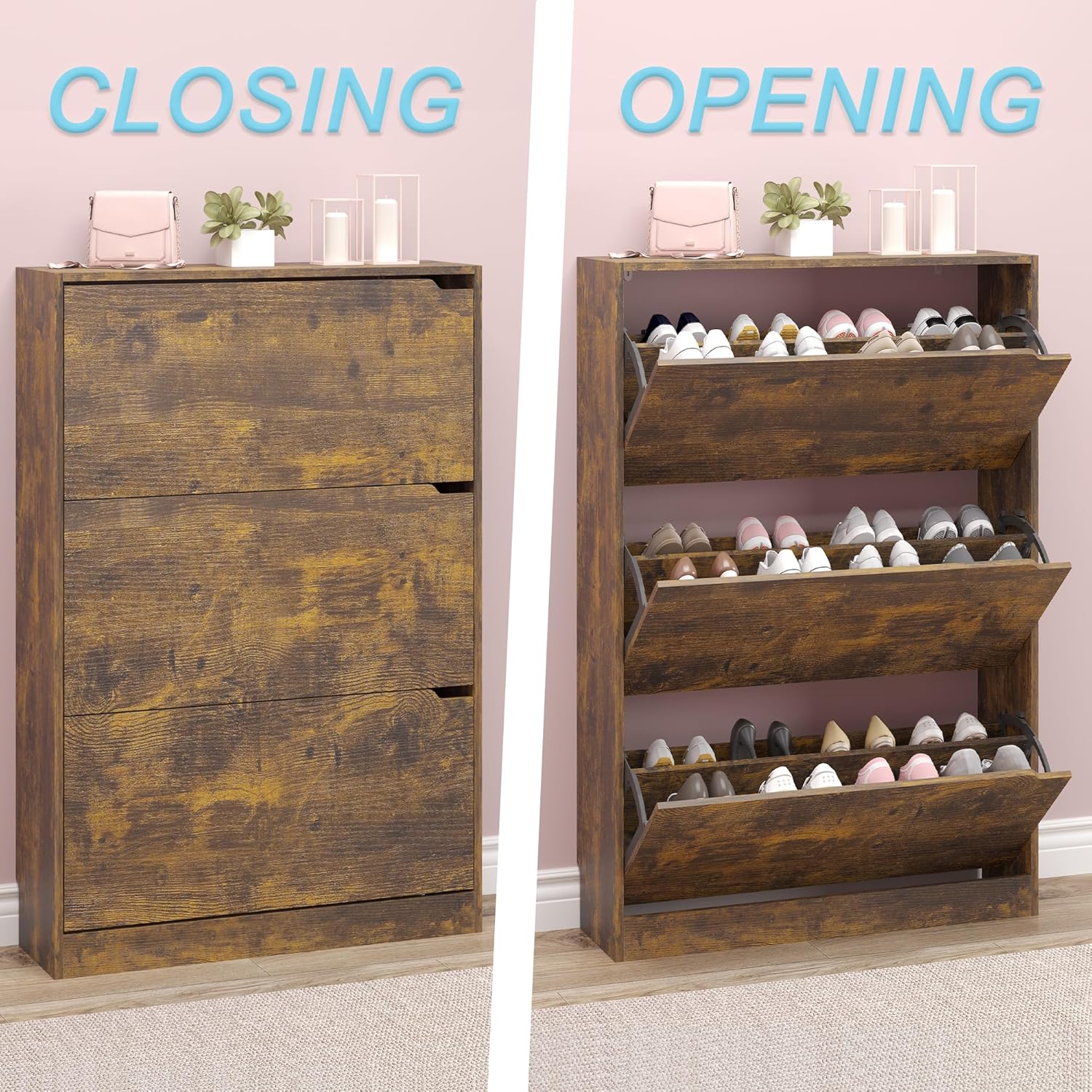 - 【3 Flip Drawers Shoe Cabinet】:The freestanding shoe cabinet adopts the design of space-saving flip drawers,this narrow shoe cabinet can be placed in a narrow space,Prevent the embarrassment of losing your shoes and misplacing them and forgetting where they are and cankeep the shoes away from dust.