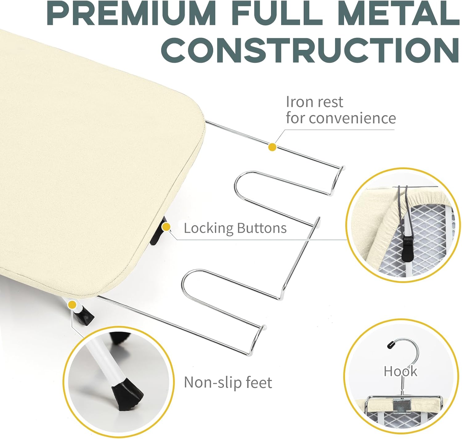 • Sturdy and Stable: The well made metal frame is sturdy and durable with a non-slip silicone cap, and the solid structure ensures that the compact ironing board tabletop is stable enough