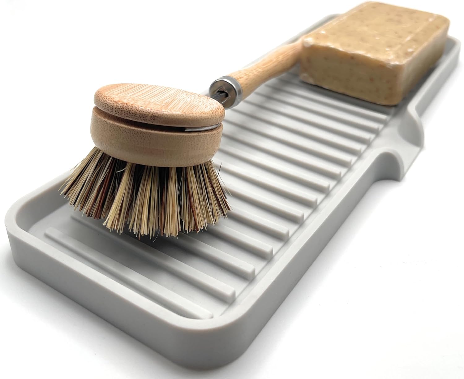 Happitasa Silicone Soap Dish Tray and Sponge Holder with Drain Chute | Bathroom and Kitchen Sink Organizer Caddy (Light Grey, 12"x4", 7.4 Ounces)