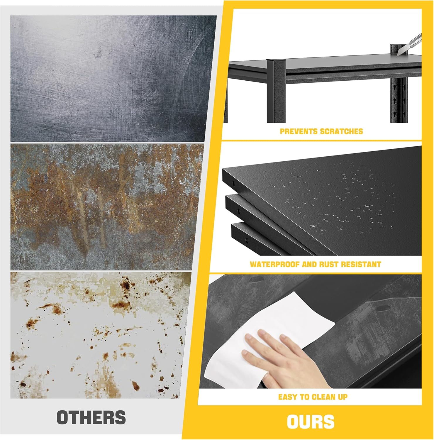 - 【RUST-PROOF, SCRATCH-PROOF, EASY-TO-CLEAN HEAVY DUTY SHELF】The garage shelving is treated with anti-rust spray paint, the metal material and special surface treatment can prevent the rust problem caused by the humid environment; the smooth metal surface design makes this shelf very easy to clean and take care of daily. Each shelf is equipped with protective pads to protect floors from damage.