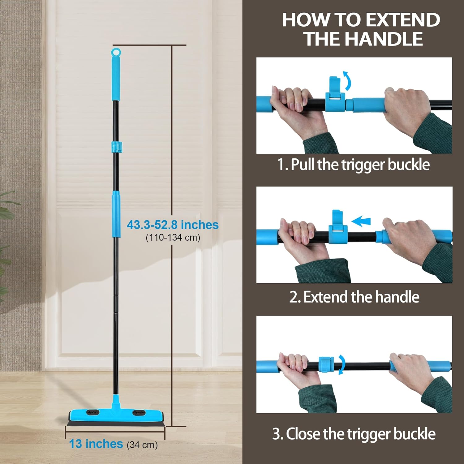 • 52.8 inches Telescopic Handle: After pulling the trigger, you can adjust the the length of the pet broom from 43.3” to 52.8”. This rug rake allows you stand upright for comfortably sweeping. No more bending, kneeling or crouching when doing housework