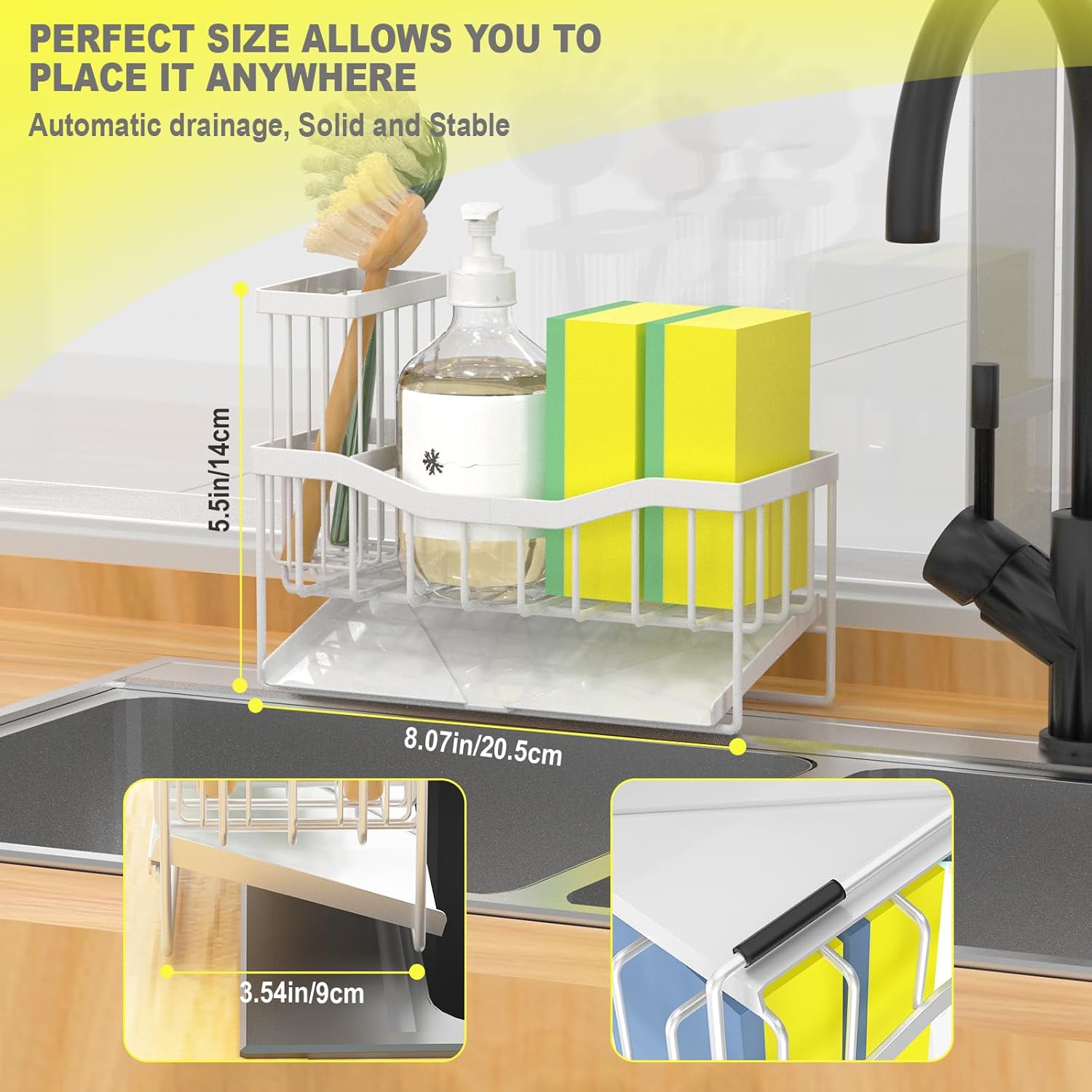 - 【Sturdy Bottom Anti-Slip Design】Installing 4 non-slip pads on the bottom of the kitchen caddy to ensure that the sponge caddy is fixed to the surface of the kitchen sink counter and will not fall and move due to the unstable center of gravity, while protecting the kitchen counter from scratches.