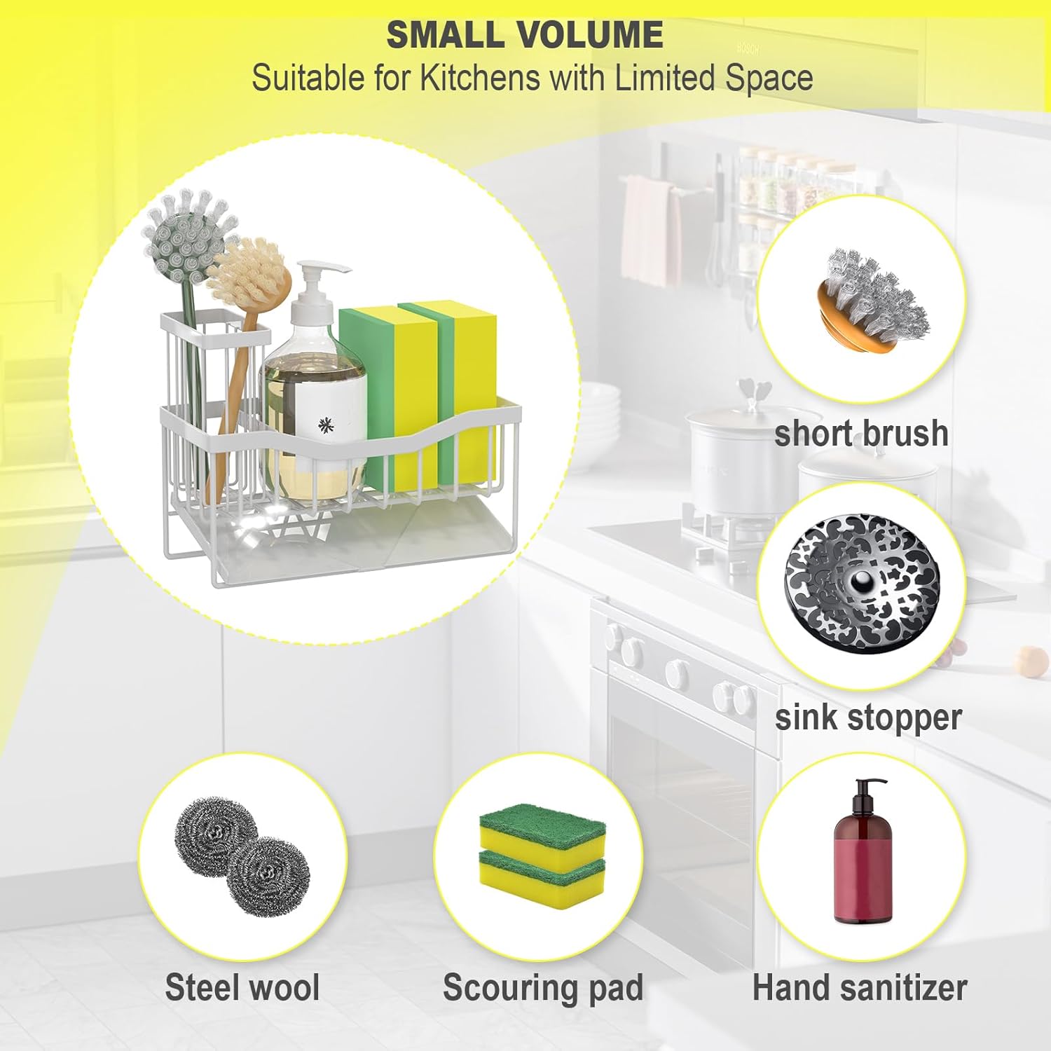 - 【Small Volume】Kitchen sink organizer is suitable for kitchens with limited space. It measures only 8.10"*3.60"*5.50"and can hold a detergent bottle, 2 sponge balls or sink stopper. It fits neatly on your countertop near the sink without taking up too much space and make your kitchen look cleaner.