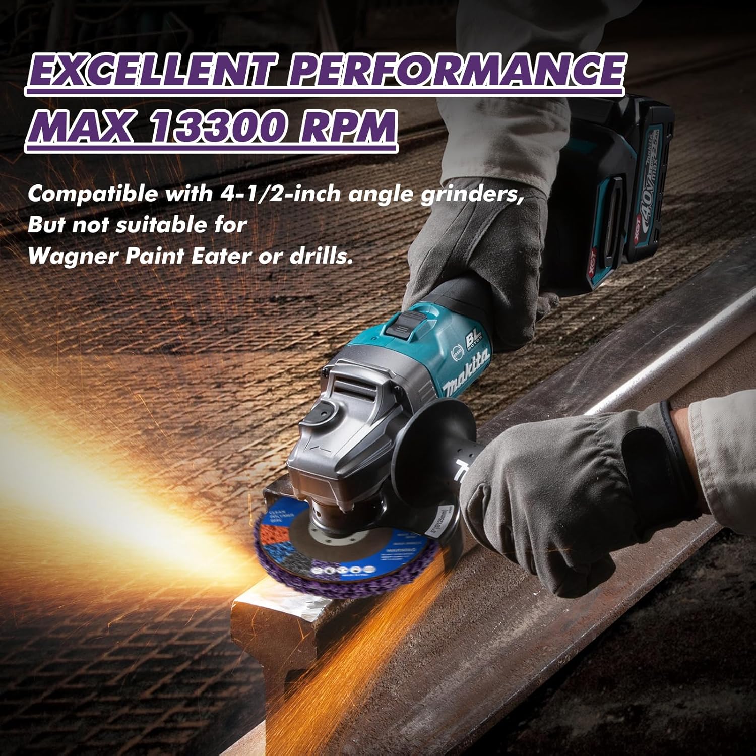 - Compatible with Angle Grinders: Each strip disc rust remover measures 4-1/2 inches in diameter, 3/5 inches thick, with a 7/8-inch hole, and can operate at speeds up to 13,300 RPM. Suitable for all standard 4-1/2 inch angle grinders but not for use with Wagner Paint Eater or drills.