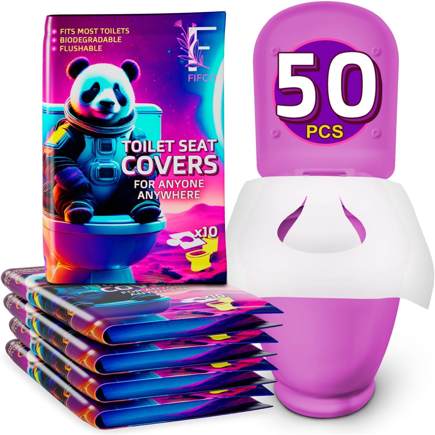 50 Pcs Disposable Toilet Seat Cover - Biodegradable and Flushable Toilet Seat Liners for Public Toilets | Compact One Size Fits All Travel Essentials Toiletries Covers | FIFCO