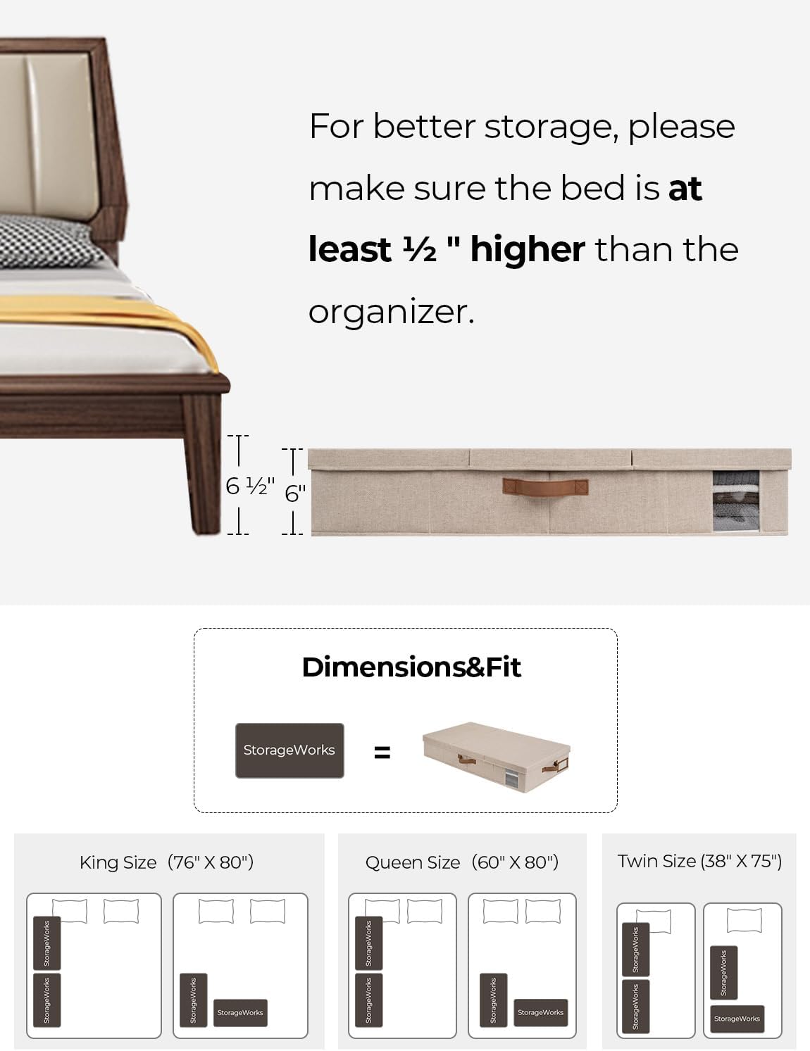 - Huge Capacity: Measuring 33 x 17 x 6 inches, the underbed storage containers provide plenty of capacity to store a variety of goods, including clothing, blankets, bedding and shoes, making the most of your underbed storage space and keeping the room organized. For optimal use, please make sure the bed is at least 6.5 inches high.