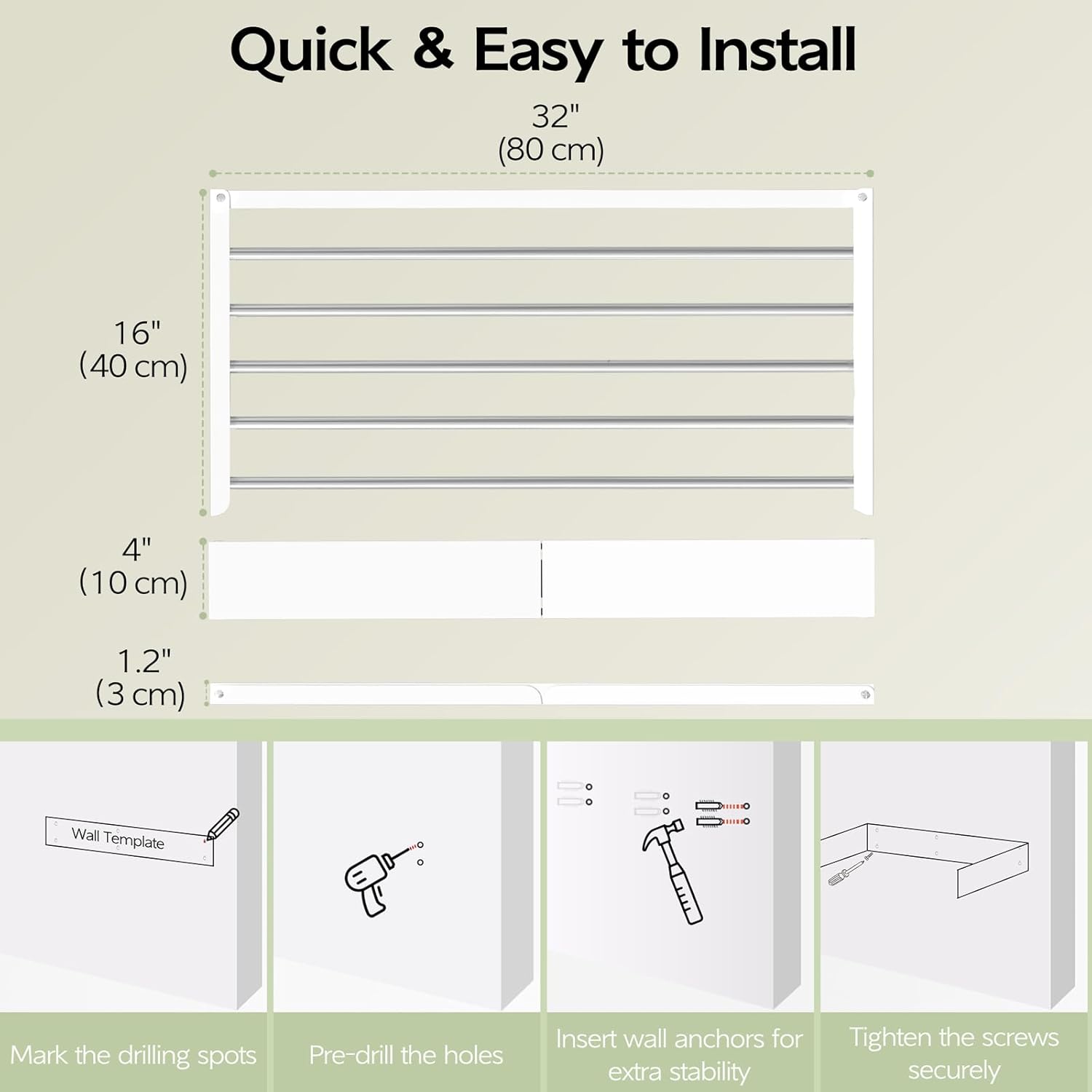 - Stylish Appearance: The appearance of the folding drying racks for laundry is sleek and stylish, adding a touch of sophistication to your home's ambiance. VIKAQI clothes rack drying comes pre-assembled and only requires drilling and installation onto the wall to be ready for use. It includes a cardboard template that makes installation really easy.