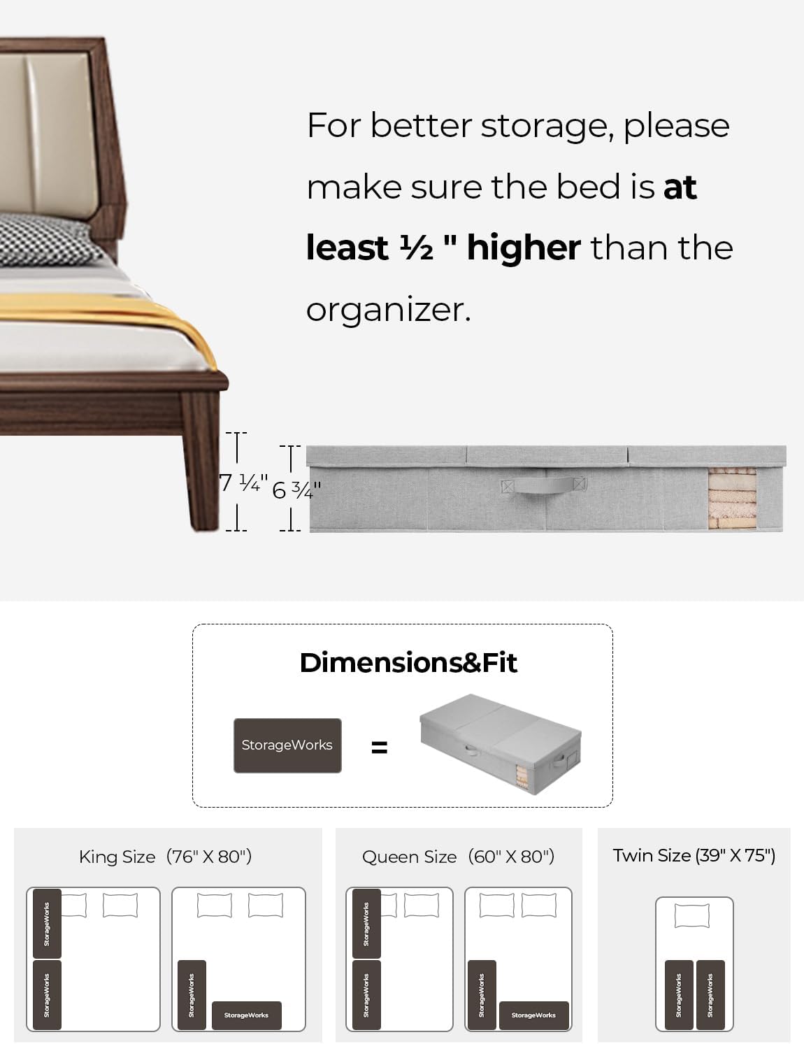 • Large Capacity: With dimensions of 39 ¼"L×17"W×6 ¾"H inches, the under bed storage containers offer ample space for storing a range of items, including clothes, blankets, bedding and shoes, maximizing your underbed storage space and organizing your bedroom. Please make sure that your bed is at least 7 inches high for better use.
