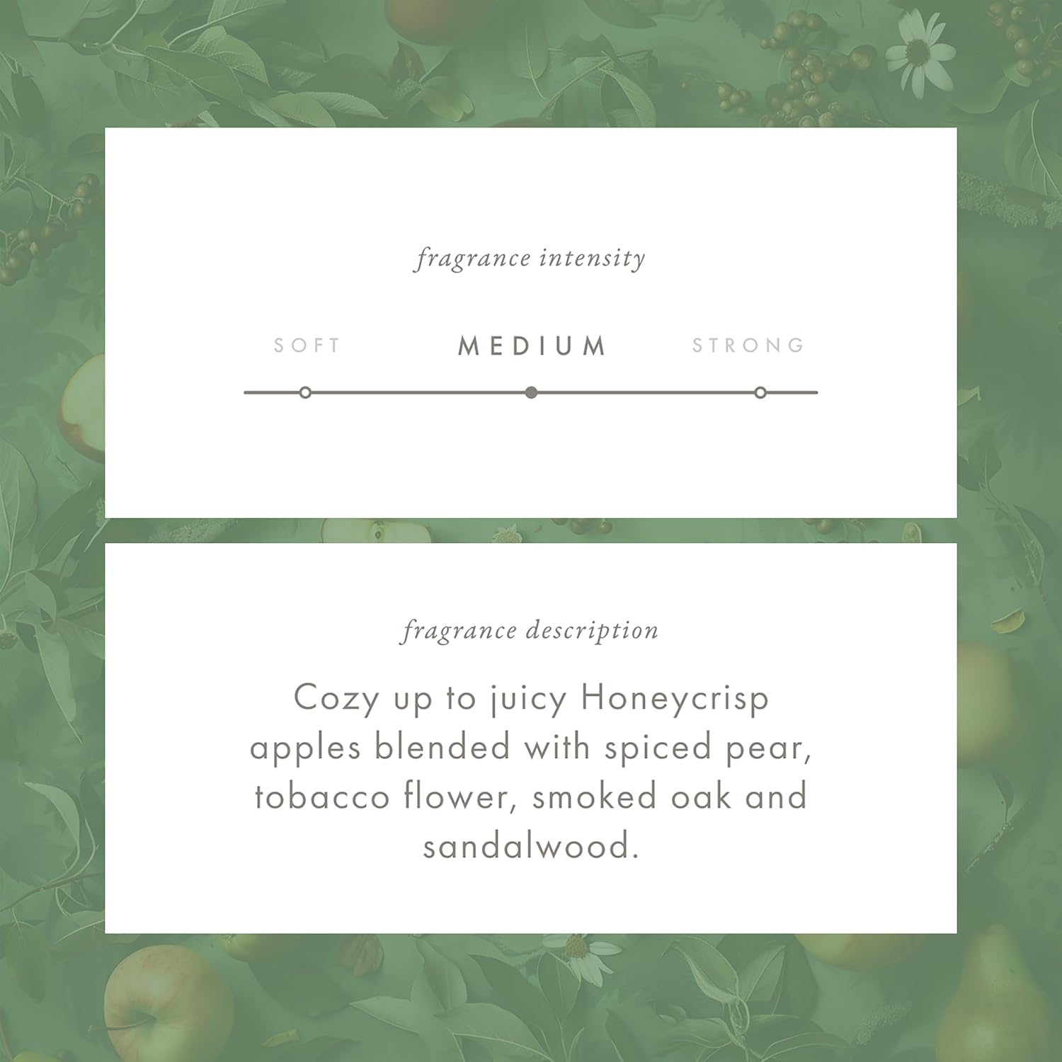 • THE FRAGRANCE: Embrace the crisp freshness of Honeycrisp apples and spiced pear, layered with the warmth of tobacco flower, smoked oak, and sandalwood, evoking a sunlit stroll through an orchard in late August.